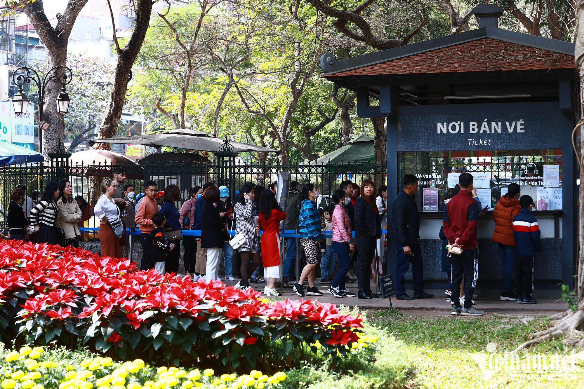 Người dân xếp hàng mua vé để vào khu di tích Văn Miếu rất đông chiều mùng 3 Tết. Giá vé vào cửa 30.000 đồng/người lớn, riêng trẻ em dưới 15 tuổi được tham quan miễn phí.