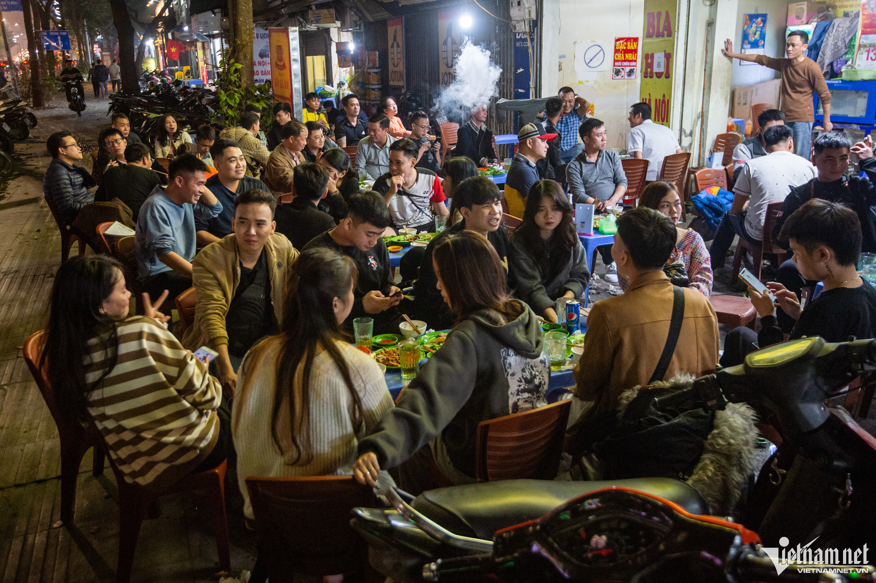 Các quán ăn, nhà hàng ở trung tâm thủ đô đông đúc khách hẹn hò, tụ tập liên hoan nhân dịp cuối năm. Hình ảnh tại phố Trần Phú (quận Ba Đình) tối 14/1.