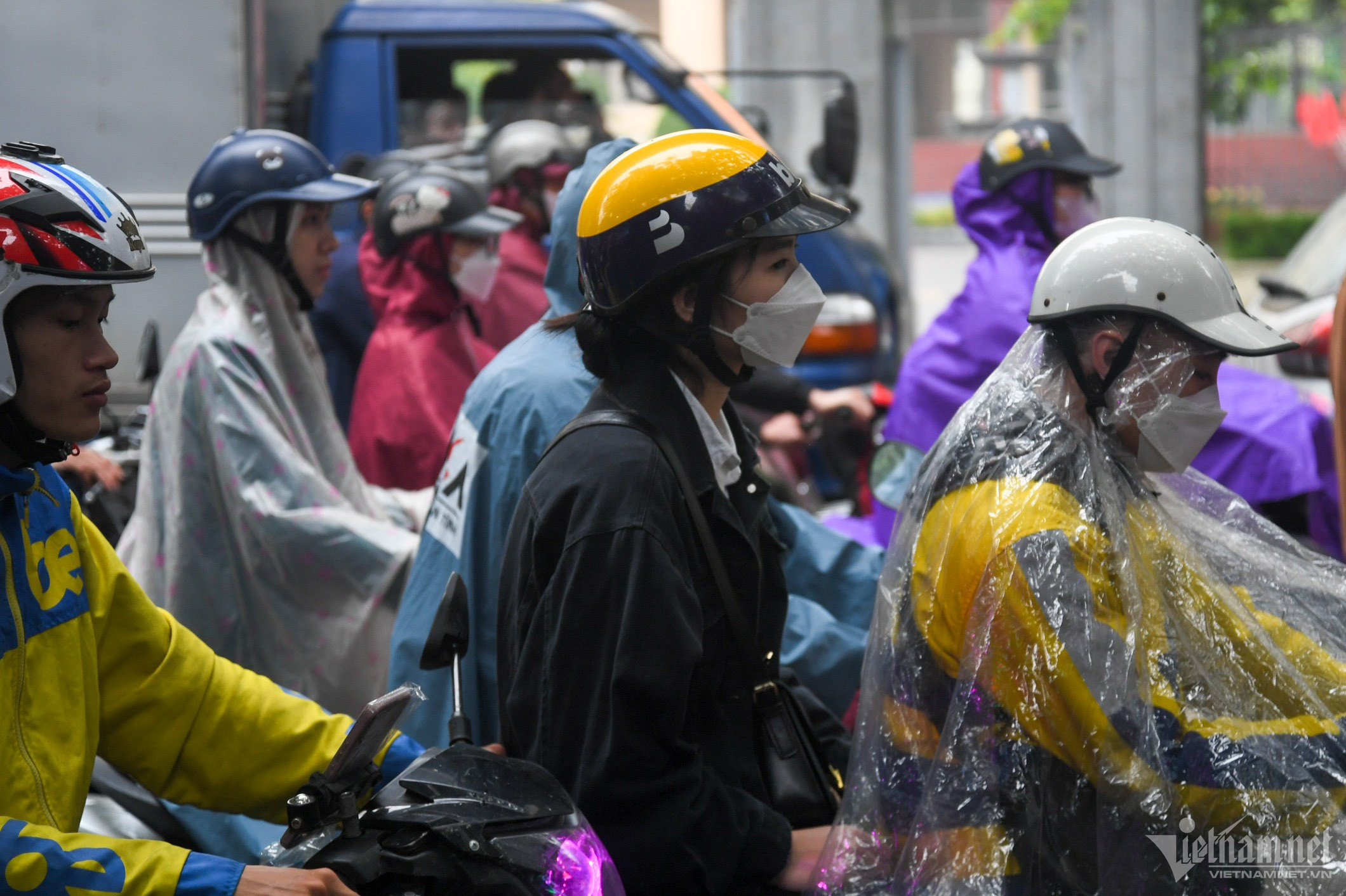 Mỗi ngày người phụ nữ (khẩu trang xanh) đi từ Phú Diễn (quận Bắc Từ Liêm) đến Yết Kiêu (quận Hoàn Kiếm) hết 15km để tới cơ quan. “Nay biết trời mưa có thể tắc đường, tôi đã đi từ 8h15 nhưng mất 20 phút mới tới được đường Xuân Thuỷ, khả năng bị muộn giờ làm 30 phút”, chị nói trong lúc dừng xe chờ đợi.