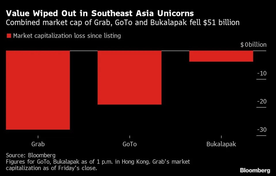 GoTo – tập đoàn hình thành từ vụ sáp nhập giữa Gojek và Tokopedia – có vụ IPO lớn nhất năm nay, trong khi Bukalapak niêm yết năm 2021. Hai cái tên sáng giá của công nghệ Indonesia lần lượt giảm 74% và 69% giá trị so với ngày đầu lên sàn.