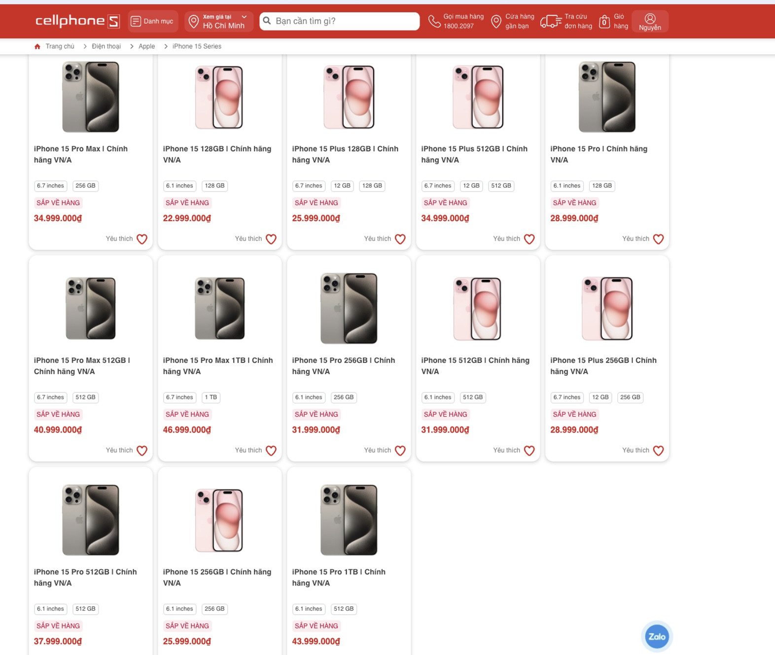 Trên website của Apple Việt Nam cũng đã cho khách hàng đặt trước sản phẩm từ ngày 22/9 và giao hàng ngày 29/9 với mức giá bản dung lượng thấp nhất 128GB từ 22.999.000 đồng cho dòng iPhone 15, 25.999.000 đồng cho iPhone 15 Plus và 28.999.000 đồng cho iPhone 15 Pro. Riêng dòng iPhone 15 Pro Max chỉ bắt đầu từ bản 256GB và có mức giá 34.999.000 đồng.