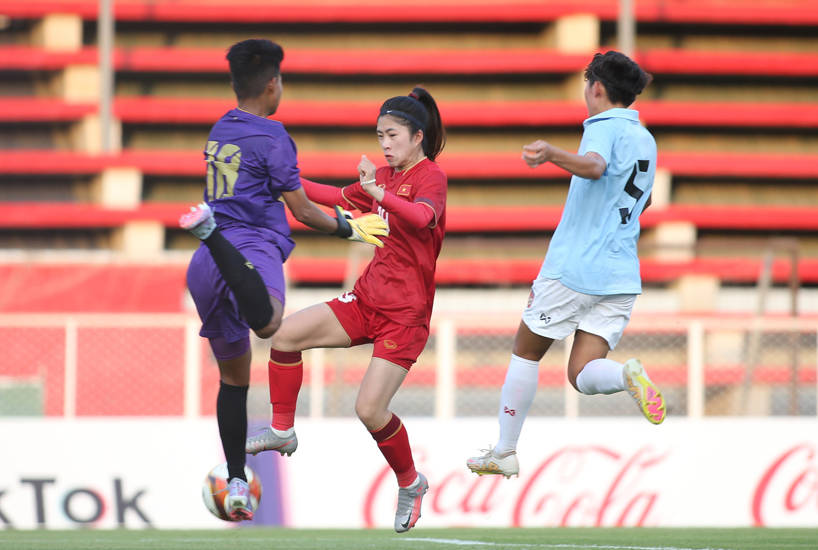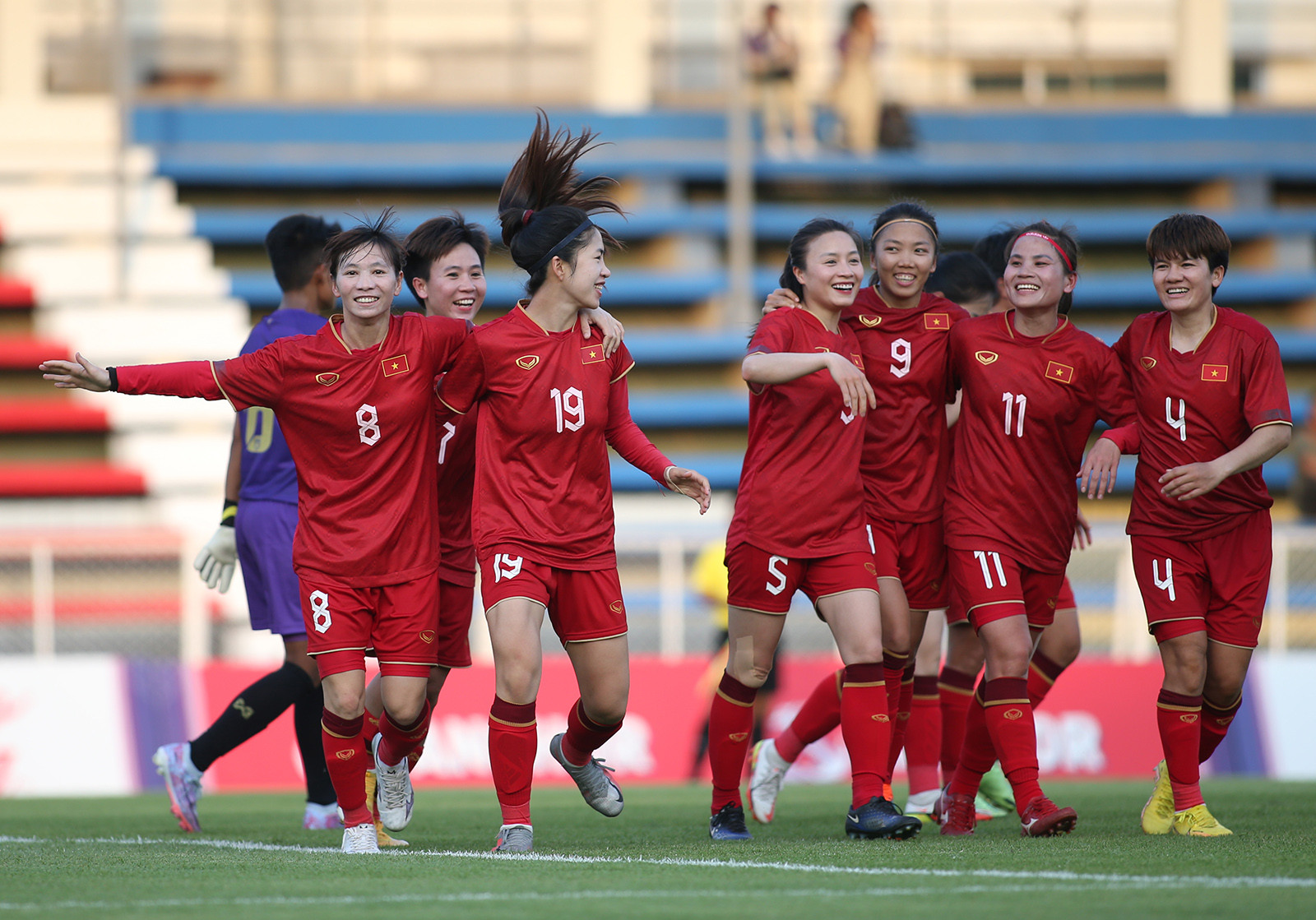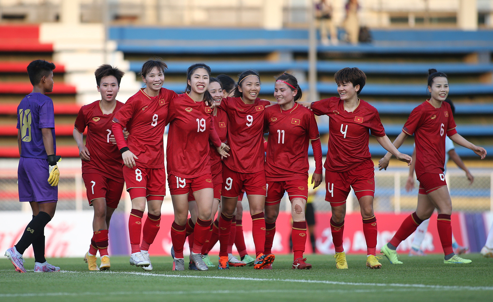 Ở trận tuyển nữ Việt Nam gặp Myanmar, HLV Mai Đức Chung cất Thanh Nhã trên băng ghế dự bị. Cầu thủ có biệt danh "cơn lốc đường biên" được giữ sức để tung vào sân trong hiệp 2 nhằm tạo ra sự đột biến.Trong khi đó, trung vệ Hoàng Thị Loan được đá chính. Cô gái người Hà Nội nổi bật trên sân bởi là da trắng, gương mặt xinh đẹp.Hoàng Thị Loan có vai trò quan trọng ở hàng thủ tuyển nữ Việt Nam sau khi Chương Thị Kiều không được đăng ký dự SEA Games vì chưa hoàn toàn bình phục chấn thương.Trung vệ sinh năm 1995 có màn trình diễn tốt. Cô là người có pha kiến tạo giúp Thanh Nhã nâng tỷ số lên 2-1 cho tuyển nữ Việt Nam ở trận gặp Myanmar.Thanh Nhã sau khi được tung vào sân lập tức tạo nên sự khác biệt trong lối chơi của tuyển nữ Việt Nam. "Cơn lốc đường biên" với thể lực sung mãn có những pha bức tốc ở cánh phải, khiến các cầu thủ Myanmar không thể theo kịp.Thanh Nhã là một trong những quân bài tẩy của HLV Mai Đức Chung.Bàn thắng của Thanh Nhã dường như đặt dấu chấm hết cho tuyển nữ Myanmar.Thanh Nhã, Hoàng Thị Loan cùng các đồng đội ăn mừng bàn thắng.Cả Thanh Nhã và Hoàng Thị Loan đều được ví là "hoa khôi" của tuyển nữ Việt Nam.Cả hai có một trận đấu hiệu quả cao nhất. Đây là điều HLV Mai Đức Chung rất hài lòng bởi tuyển nữ Việt Nam dần thích nghi với điều kiện thời tiết khắc nghiệt tại Campuchia.Thanh Nhã ăn mừng bàn thắng cùng 2 đàn chị Tuyết Dung và Thùy Trang.Mỗi khi Thanh Nhã và Hoàng Thị Loan có bóng, các CĐV của Việt Nam và Campuchia đều dành những tràng pháo tay động viên, những tiếng hò hét vì yêu mến cả về tài năng và sắc đẹp.
