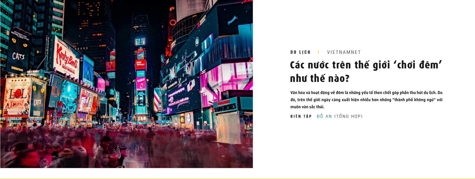 Hiện nay, hơn 40 thành phố lớn trên thế giới đã và đang ban hành các chính sách liên quan đến việc hỗ trợ phát triển các hoạt động kinh doanh, dịch vụ về đêm. Trên thực tế, nhiều thành phố tự hào về cuộc sống ban đêm phong phú và sử dụng nền kinh tế ban đêm thịnh vượng của họ để thu hút khách du lịch nước ngoài đồng thời kích thích nhu cầu chi tiêu.