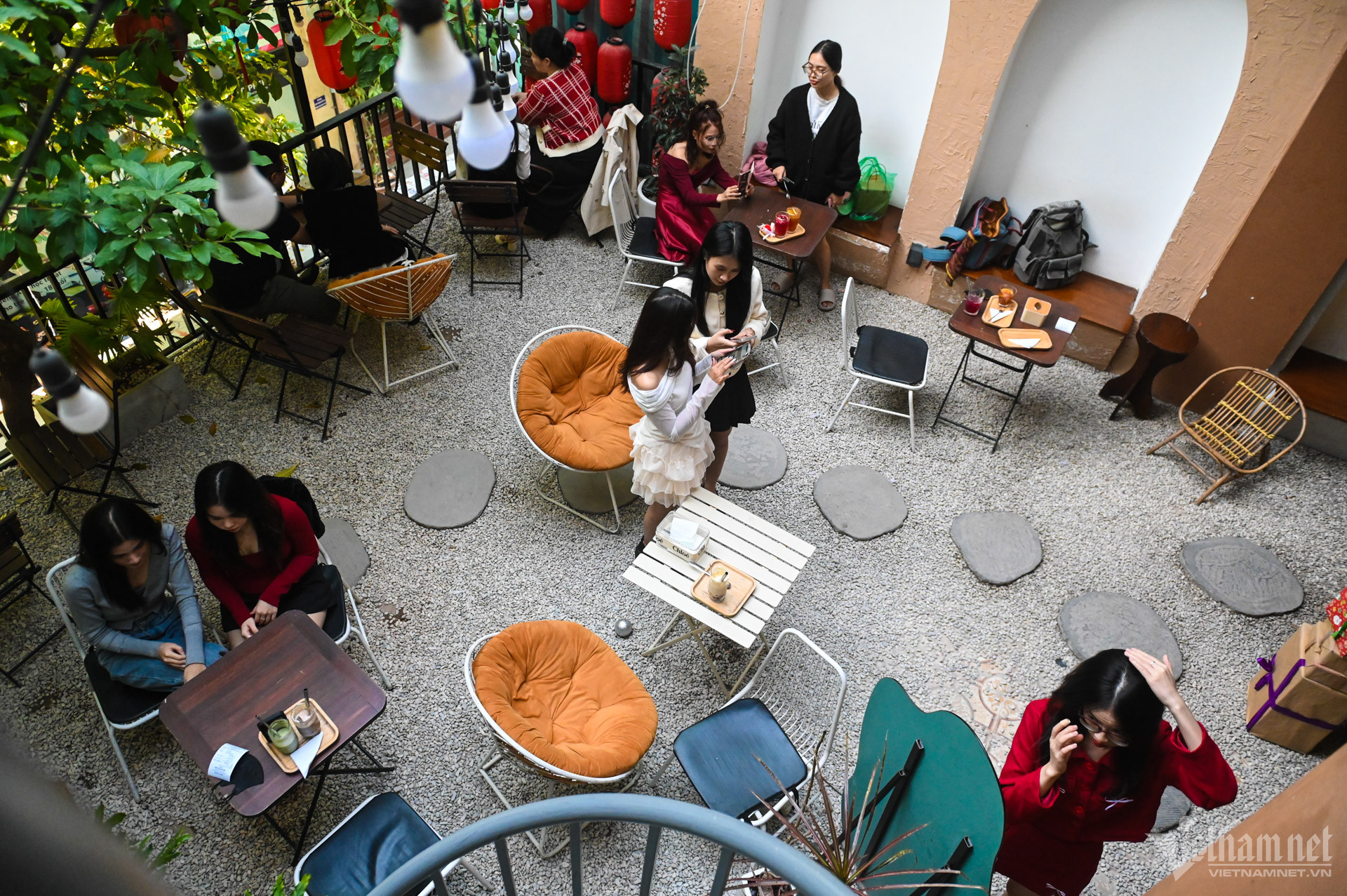 Bạn Vy, 20 tuổi (bên phải, quận Bắc Từ Liêm) có thói quen đi check-in các quán cà phê cùng bạn bè, đặc biệt vào những dịp lễ để lưu giữ kỷ niệm. "Chiều nay mình được nghỉ học nên tranh thủ đi cà phê chụp ảnh. Quán có không gian ngoài trời rộng nên là một điểm cộng, không phải bon chen quá nhiều", Vy nói.