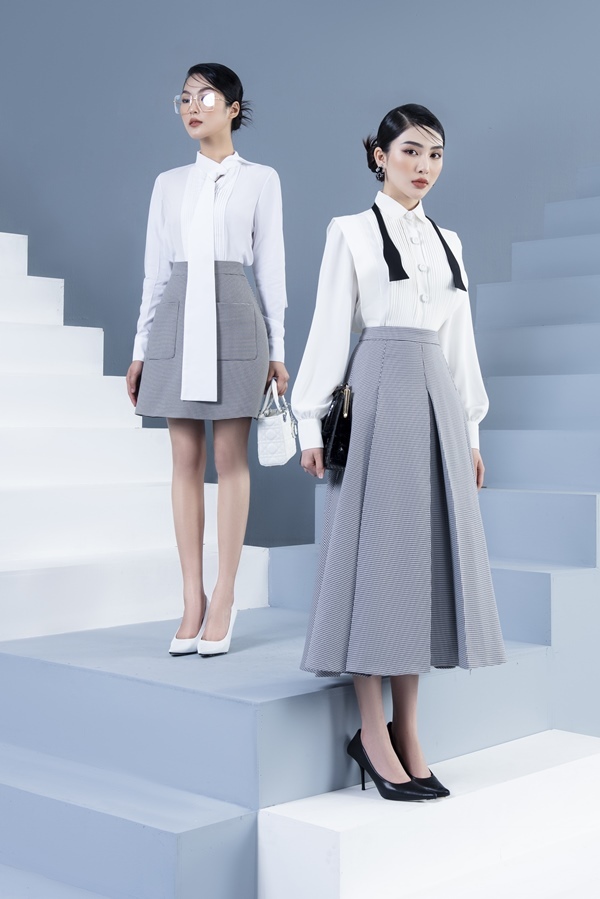 Hà Thanh Việt lựa chọn những màu sắc trắng, đen, ghi xám nhã nhặn phổ biến với đối tượng công sở. BST truyền tải cảm hứng thời trang thanh lịch thông qua sắc xám hoài cổ và câu chuyện nữ quyền được lồng ghép tự nhiên.