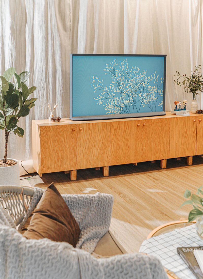 Bạn có thử nghĩ một chiếc TV khi mở lên thì sẽ chiếu bộ phim bạn yêu thích, còn khi tắt thì lại trở thành đồng hồ, màn hình dự báo thời tiết, bức tranh nghệ thuật hay poster nhân vật điện ảnh mà bạn mê mẩn sẽ hấp dẫn như thế nào? Với sức bật của công nghệ, không gì là không thể thực hiện được trong thời đại IoTs. Tính năng Ambient Mode+ khi TV chế độ chờ hay Magic Screen trên The Serif cho phép người dùng biến ảo chiếc TV trở nên thú vị, đặc biệt hơn. Chủ nhân của căn phòng trong ảnh minh hoạ có cách bài trí TV tinh tế, nhẹ nhàng với kệ TV fit-in gỗ vân tự nhiên, sàn gỗ thông, nội thất mây tre mộc mạc, cây kiểng lá ở các góc mang đậm hơi thở thiên nhiên.
