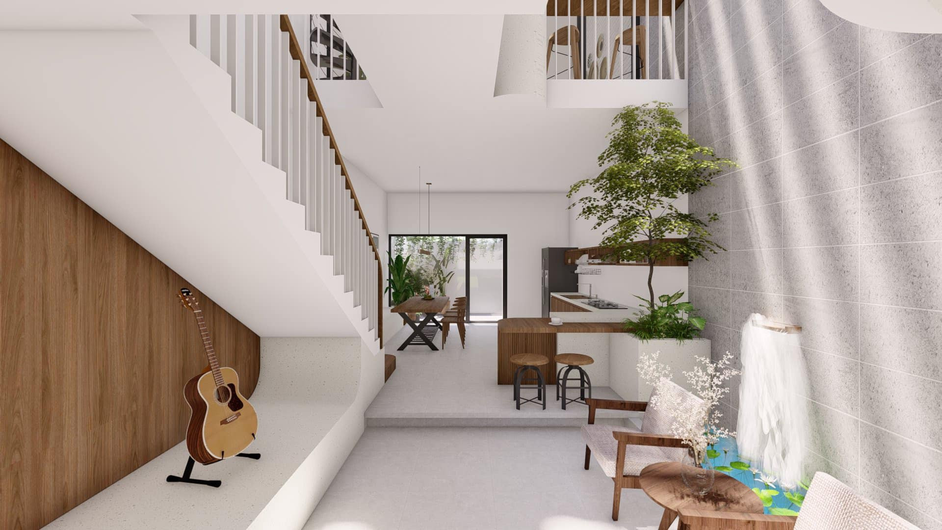 Thiết kế tối giản kết hợp với 2 giếng trời giữa và sau nhà, vừa lấy sáng vừa thông gió tự nhiên cho các thành viên cuộc sống trong lành.