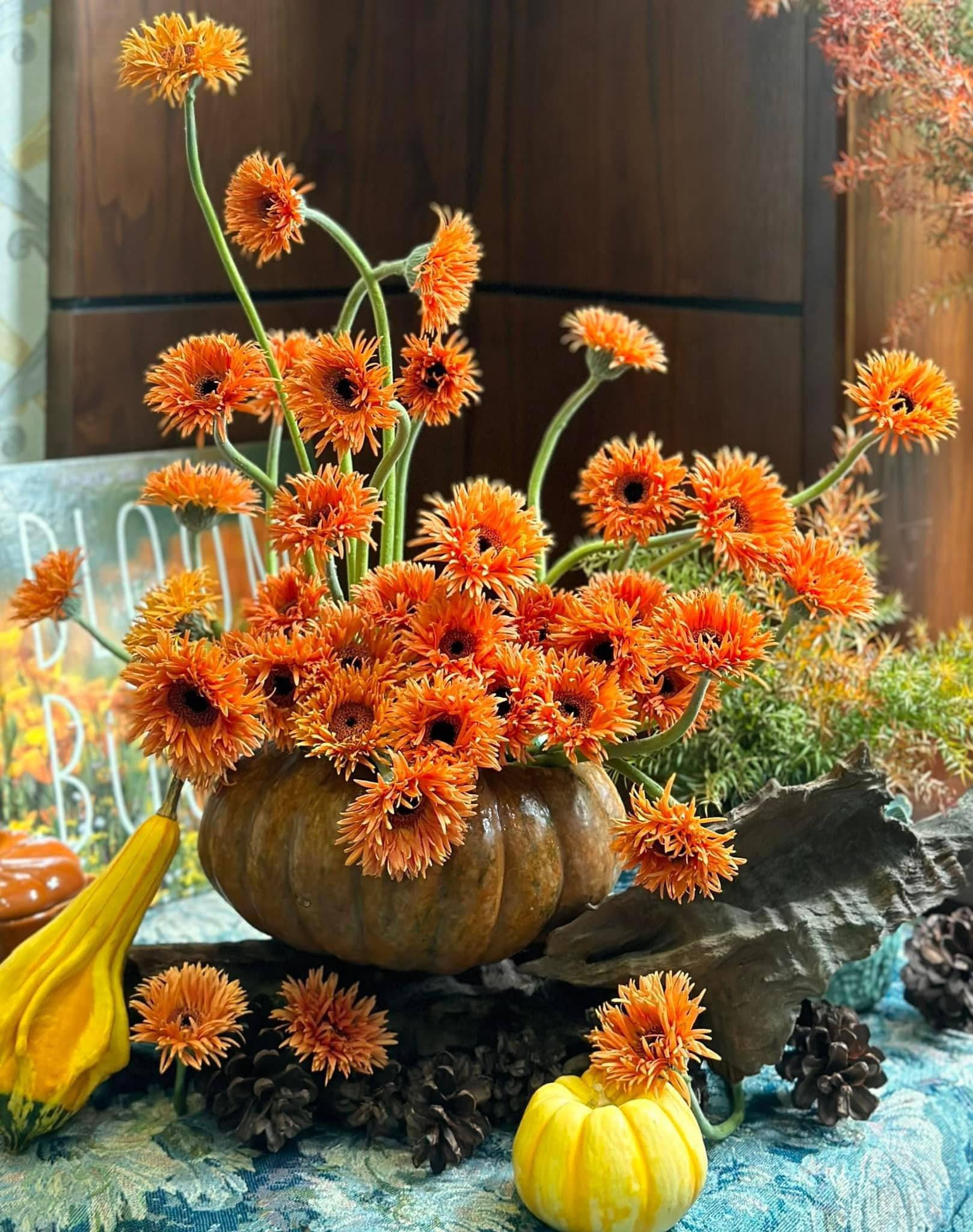 Chị Nhài cắm hoa đồng tiền trong chiếc bình làm từ quả bí đỏ, vừa độc đáo vừa đẹp mắt và chơi được cả tuần.