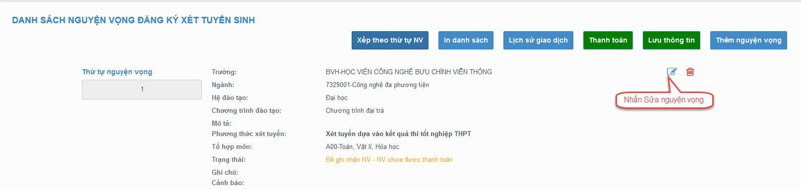Bước 1: Nhấn Sửa nguyện vọng tại nguyện vọng cần sửa