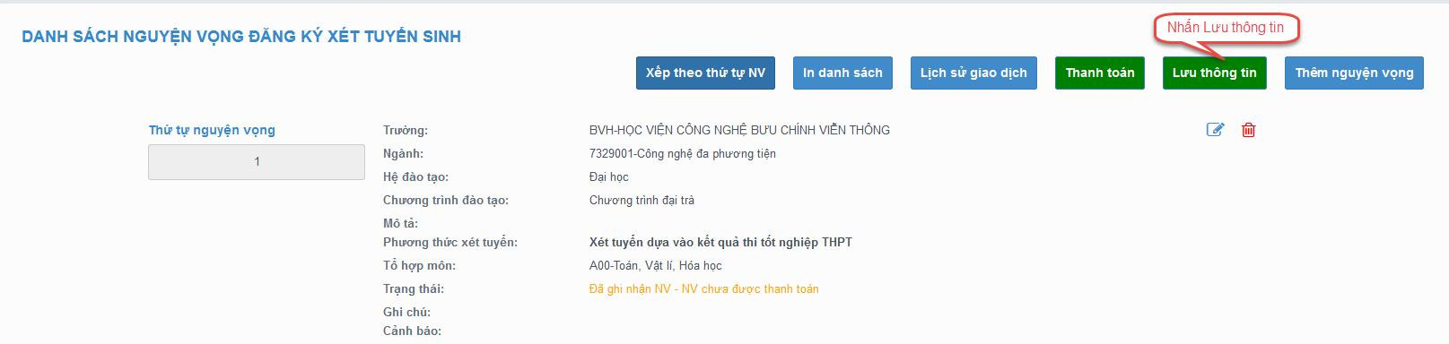 Lưu ý: Sau khi Sửa nguyện vọng thí sinh nhấn Lưu thông tin để lưu thông tin vừa sửa.