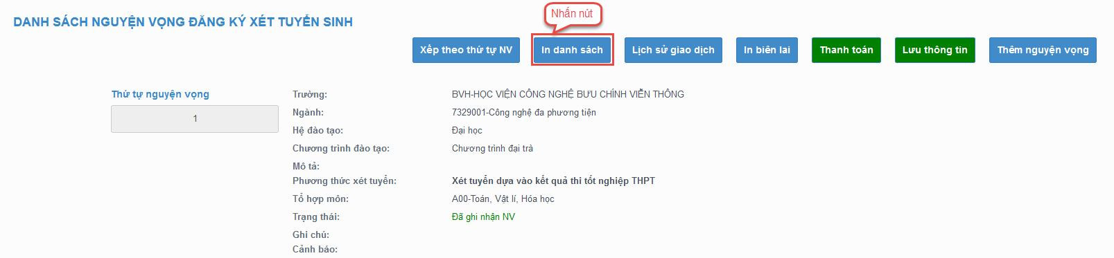 Thí sinh nhấn In danh sách để thực hiện in danh sách các nguyện vọng