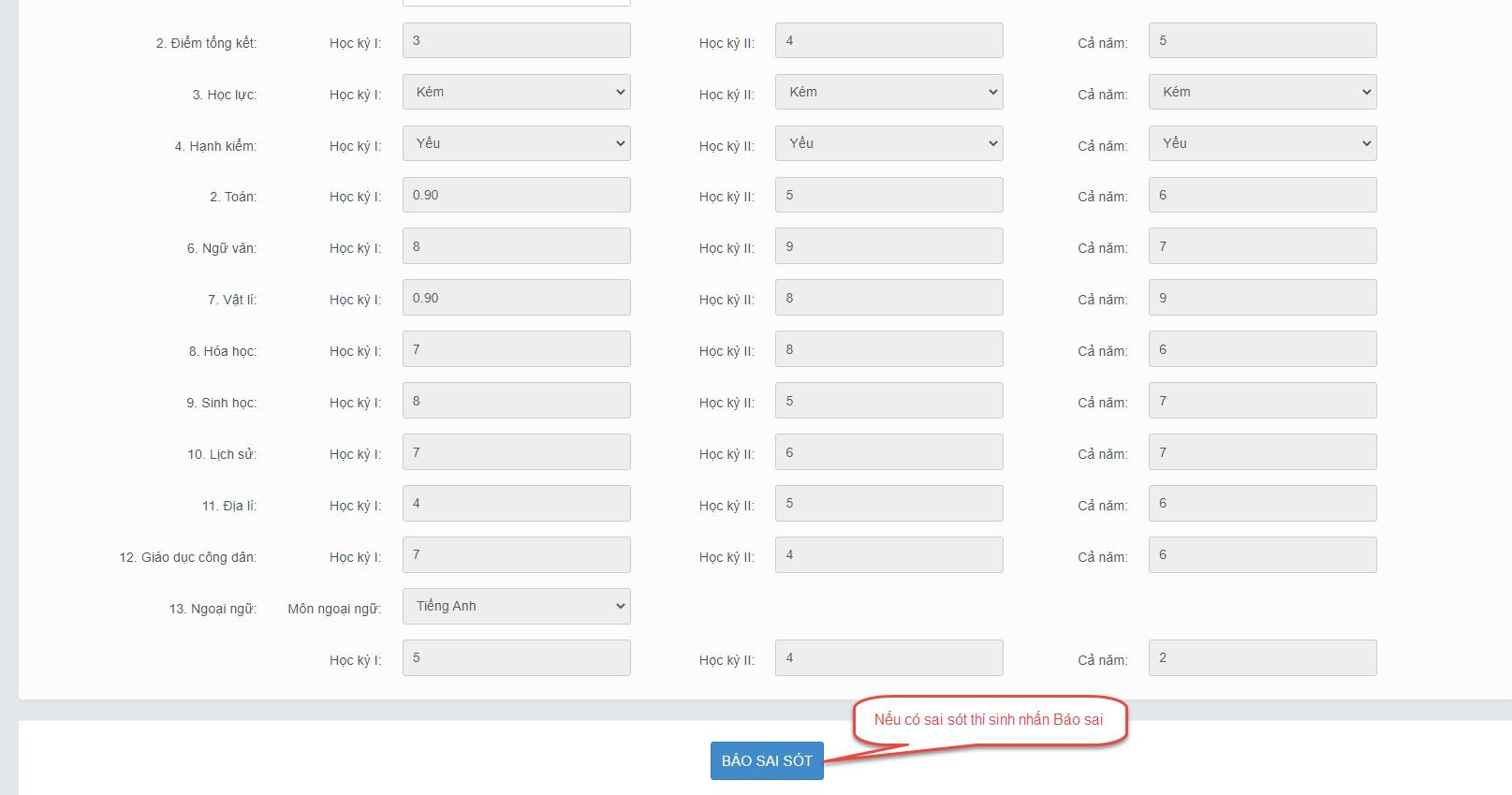 Bước 3: Sau khi xem điểm học bạ nếu thí sinh thấy có sai sót thì nhấn Báo sai sót (Lưu ý: Nút báo sai sót sử dụng để báo sai sót cho chả 3 năm học. Nếu thí sinh thấy có sai sót cả 3 năm học thì thực hiện báo sai sót cùng 1 lần).