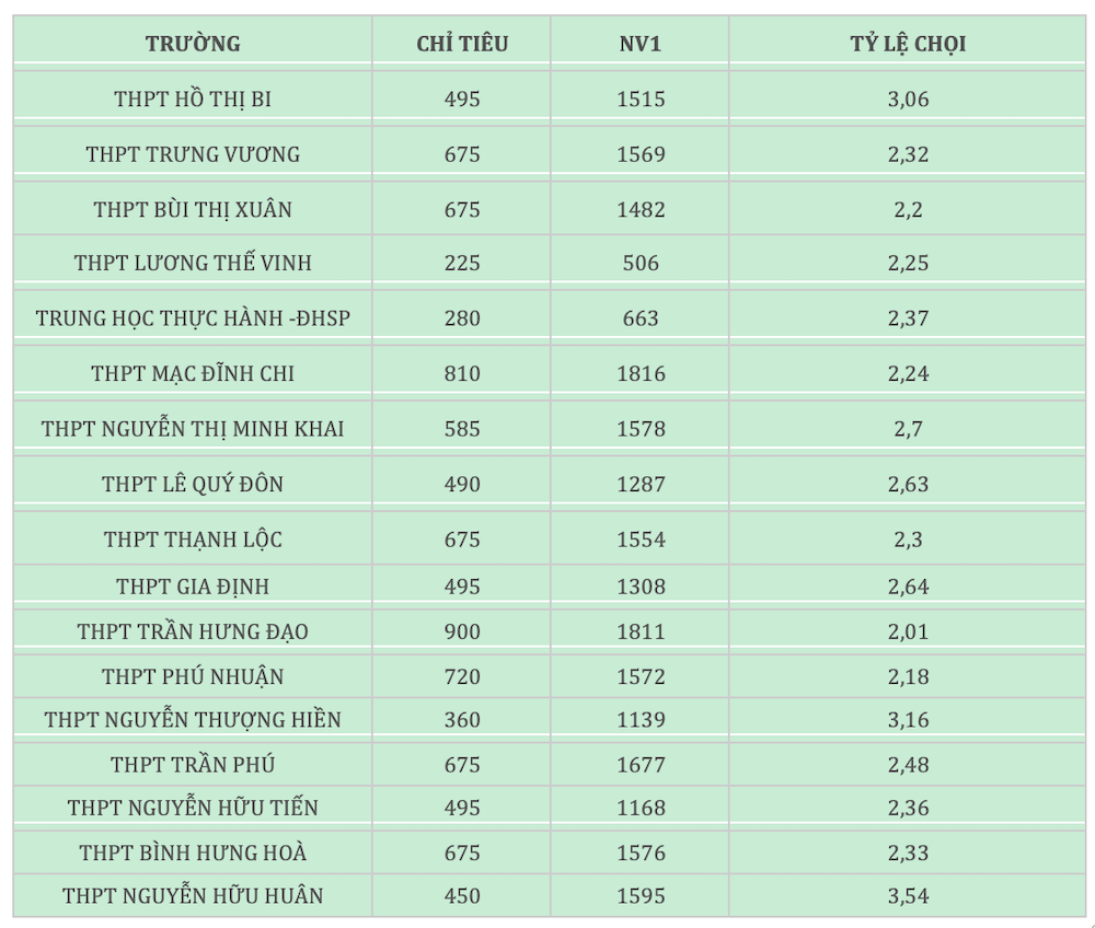 Đặc biệt, một trường ở vùng ven thành phố là Trường THPCS Hồ Thị Bi (Hóc Môn) có tỷ lệ 1/3,06. Nhiều trường khác có tỷ lệ "chọi" trên 2 như THPT Nguyễn Thị Minh Khai 1/2,7, THPT Gia Định 1/2,64, THPT Lê Quý Đôn 1/2,63, THPT Phạm Văn Sáng 1/2,6, THPT Trần Phú 1/2,48, Trung học Thực hành ĐH Sư phạm 1/2,37, THPT Nguyễn Hữu Tiến 1/2,36, THPT Bình Hưng Hòa 1/2,33, THPT Trưng Vương 1/2,32, THPT Thạnh Lộc 1/2,3, THPT Lương Thế Vinh 1/2,25, THPT Mạc Đĩnh Chi 1/2,24, THPT Bùi Thị Xuân 1/2,2, THPT Thủ Đức 1/2,19, THPT Phú Nhuận 1/2,18, THPT Trần Hưng Đạo 1/2,01.