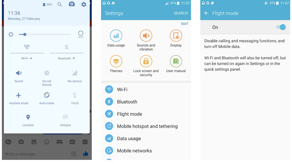 Trên Android, ở màn hình chính, vuốt từ trên xuống để mở ra trình đơn rồi chọn chế độ máy bay (flight mode).