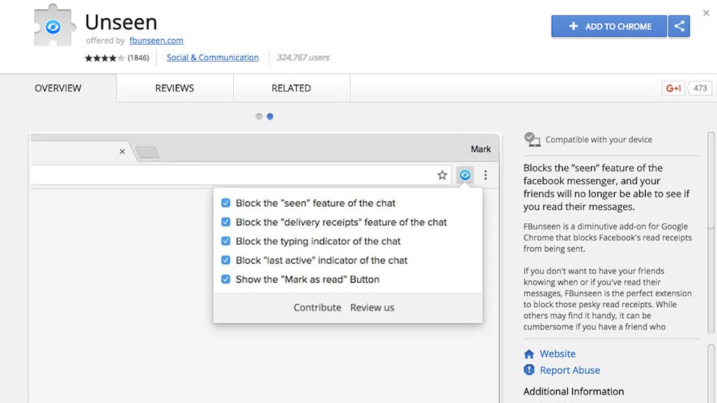 Do Facebook không có cài đặt tắt “đã xem”, bạn phải dùng ứng dụng của bên thứ ba để cài vào trình duyệt. Nếu dùng Chrome, bạn có khá nhiều lựa chọn. Nhập chrome://apps vào thanh địa chỉ trình duyệt rồi bấm vào biểu tượng Web Store rồi tìm kiếm tiện ích Unseen. Đây là tiện ích mở rộng tự động chặn dấu hiệu “seen” khi bạn mở tin nhắn Facebook.