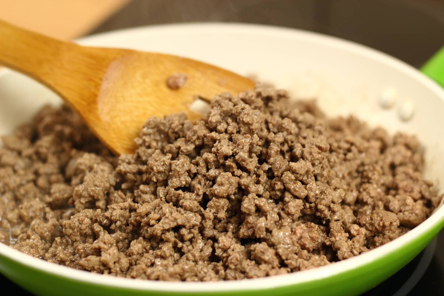 Giữ chảo ở nhiệt độ cao và thêm một chút dầu nếu chảo khô. Cho thịt lợn băm vào xào cho đến khi thịt chuyển màu nâu, khoảng 6-8 phút, dùng thìa gỗ nghiền nhỏ khi nấu. Cho tiếp 10g lá quế vào, đảo nhanh trong một phút rồi tắt bếp.