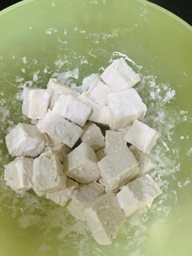 Lấy 2 muôi nhỏ bột năng như hình rắc lên tô đậu đã để ráo nước lắc đều thật đều cho bột năng bám vào từng kẽ hở của miếng đậu, làm sao cảm thấy miếng đậu nó ngậm được hết chỗ bột
