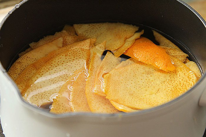 - Đun sôi nửa nồi nước trong nồi cỡ nhỏ, sau khi nước sôi thì cho vỏ cam vào luộc trong 10 phút. Việc luộc vỏ cam vừa loại bỏ cặn bẩm bám ngoài vỏ và chất đắng, vừa có thể làm mềm vỏ cam. Sau 10 phút, vớt vỏ cam ra, rửa sạch với nước.