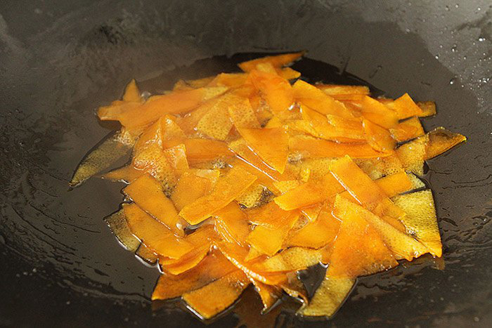 - Lúc này, thêm vỏ cam đã cắt vào, chuyển sang lửa nhỏ và đun từ từ.