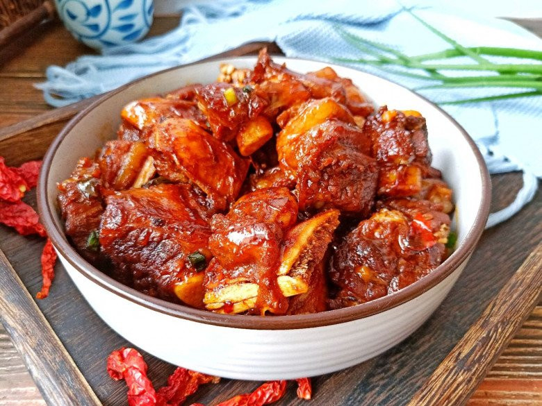 - 800g sườn bò ngon, 5g đường, 3 muỗng canh rượu nấu ăn, 3 muỗng canh nước tương, 3 lát gừng, tỏi, hành lá, gia vị vừa đủ, vài quả ớt khô băm nhỏ (không ăn được cay thì bỏ qua).