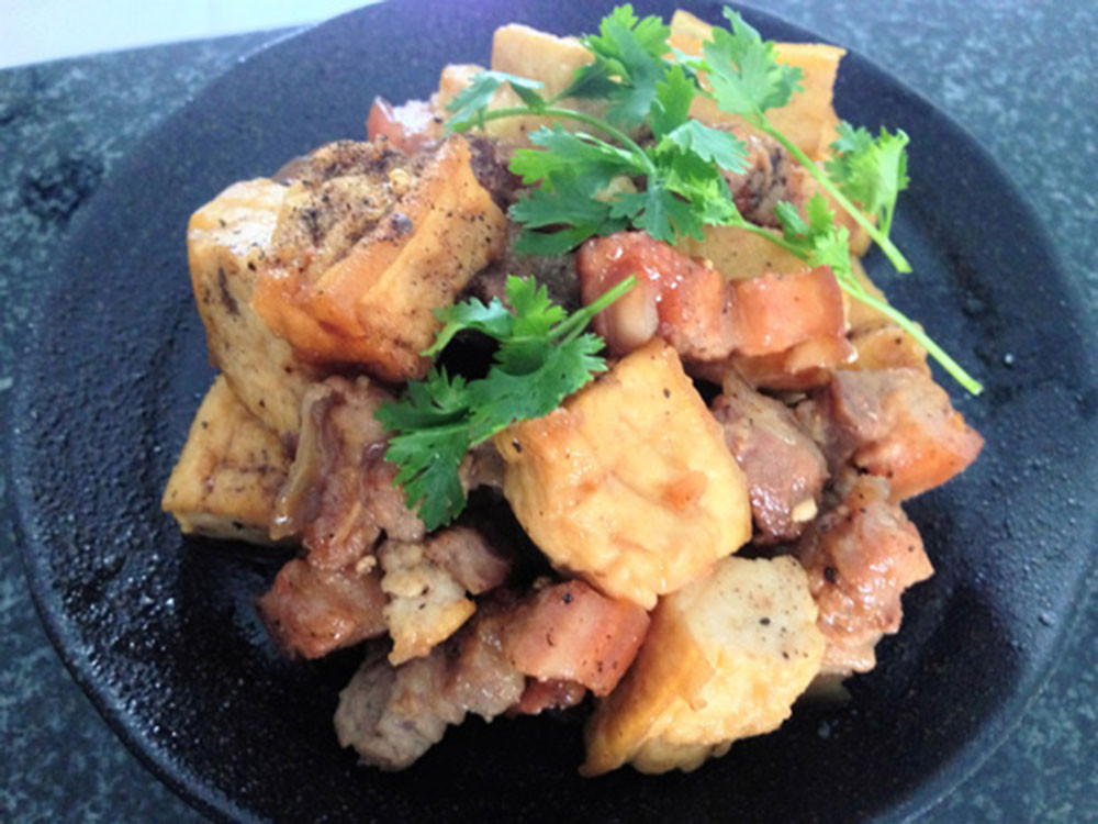 Múc thịt kho đậu hũ ra đĩa, rắc thêm tiêu và cho thêm rau mùi vào.