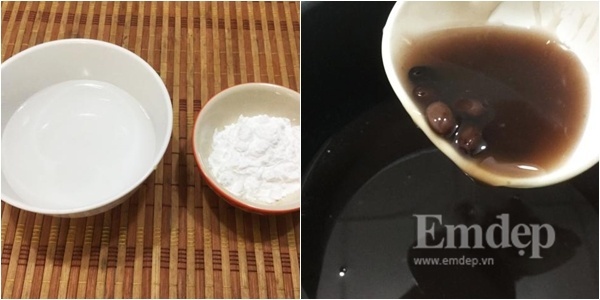 - Hòa ½ bát nước với 2 thìa bột năng đổ tiếp vào và khuấy đều cho nước chè hơi sánh lại, tắt bếp.