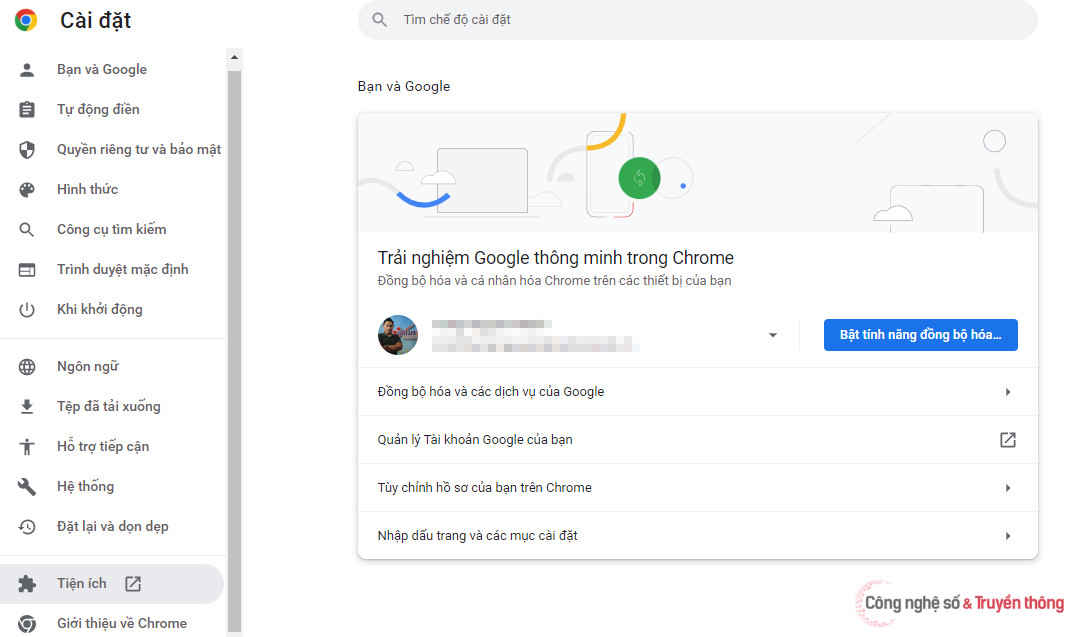 Với máy tính: Bật ứng dụng Chrome, vào phần Cài đặt, sau đó truy cập vào phần Tiện ích.