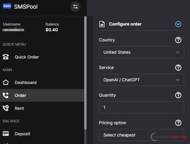 Tiếp theo, cũng trên smspool, truy cập vào tab Order và chọn các thông số (Country, Service, Quantity, Pricing Option) như trong ảnh dưới.