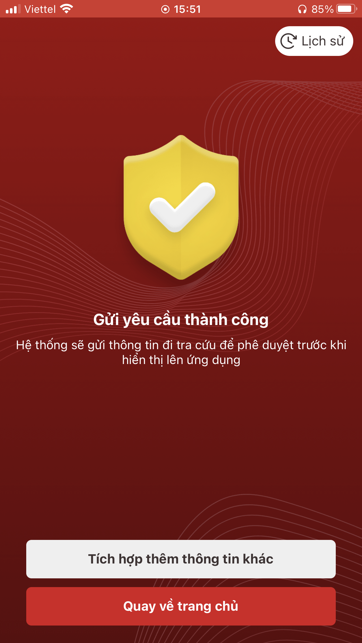 Thông báo trả về là "Gửi yêu cầu thành công - Hệ thống sẽ gửi thông tin đi tra cứu để phê duyệt trước khi hiển thị lên ứng dụng".