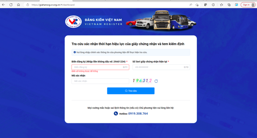 Truy cập trang web Cục Đăng kiểm Việt Nam http://www.vr.org.vn/, vào mục “Tra cứu gia hạn kiểm định”, sẽ xuất hiện trang web: https://giahanxcg.vr.org.vn, màn hình có dạng như sau: