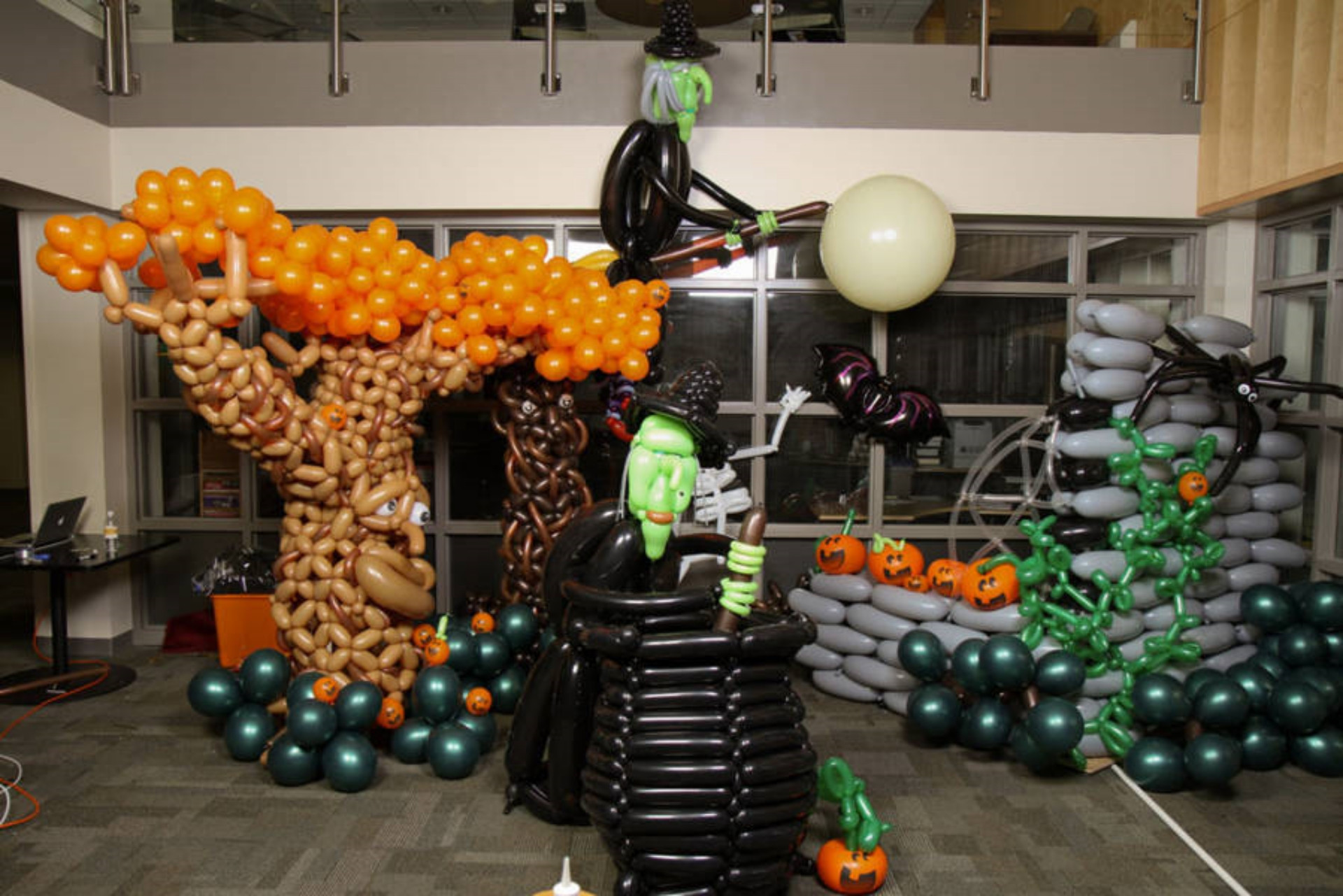 Những chiếc bong bóng với đa dạng màu sắc, kiểu dáng, kích thước sẽ là lựa chọn hoàn hảo cho bạn trang trí Halloween. Đây là một trong những cách trang trí phổ biến nhất biến không gian nơi bạn sinh sống làm việc thêm phần ấn tượng, ma mị. Hãy lựa chọn các màu sắc chủ đạo của ngày lễ Halloween như: màu cam, màu đen, màu xám bạc…