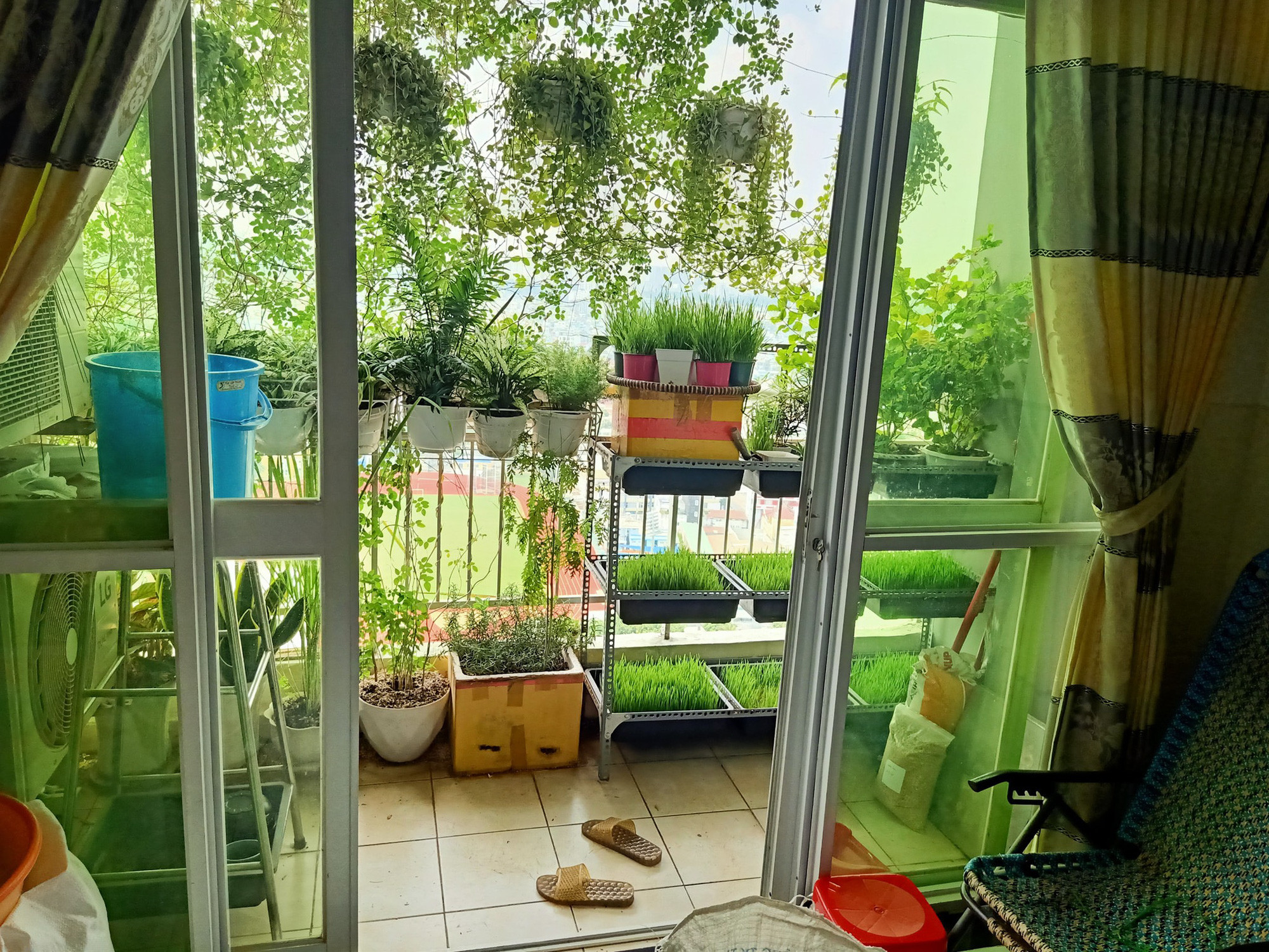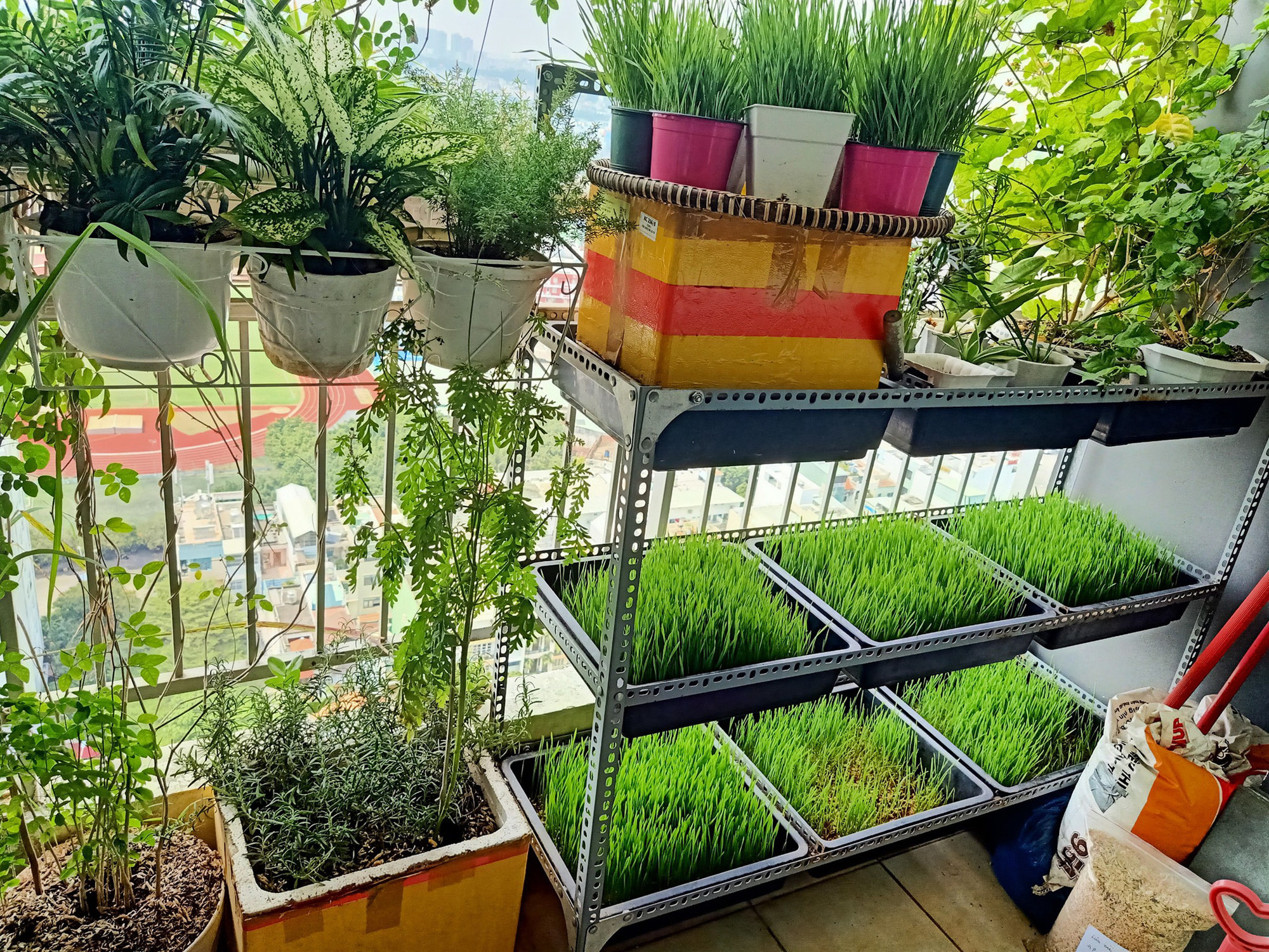Cụ thể, ban công của gia đình chị Minh Ngọc có diện tích là 1mx3m, chiều cao là 2,8m. Chị Ngọc đặt rất nhiều chậu đất trồng cây cỏ lúa mì để vừa ngăn ánh sáng nóng vào nhà lại điều hòa được không khí mát mẻ hơn.