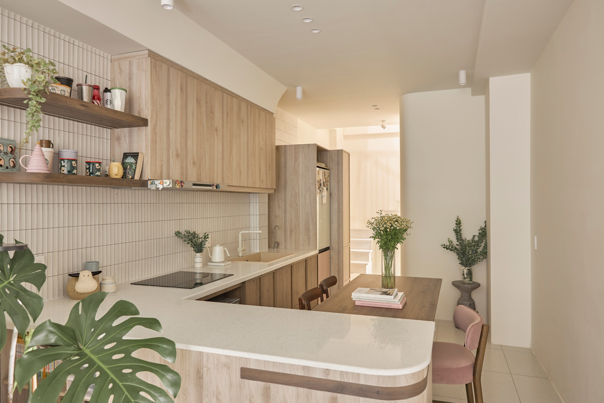 Về mặt thiết kế, với sở thích của gia chủ cũng như gia đình có nuôi các bé mèo và 1 chú chó nên hạn chế tối đa đồ nội thất rời mà tập trung theo cụm, ít chi tiết để dễ dàng lau dọn. Tầng trệt là không gian chung để sinh hoạt, nấu ăn và đón khách nên nội thất sẽ phần nhiều là hệ tủ bếp trung tâm, sofa, bàn ăn.