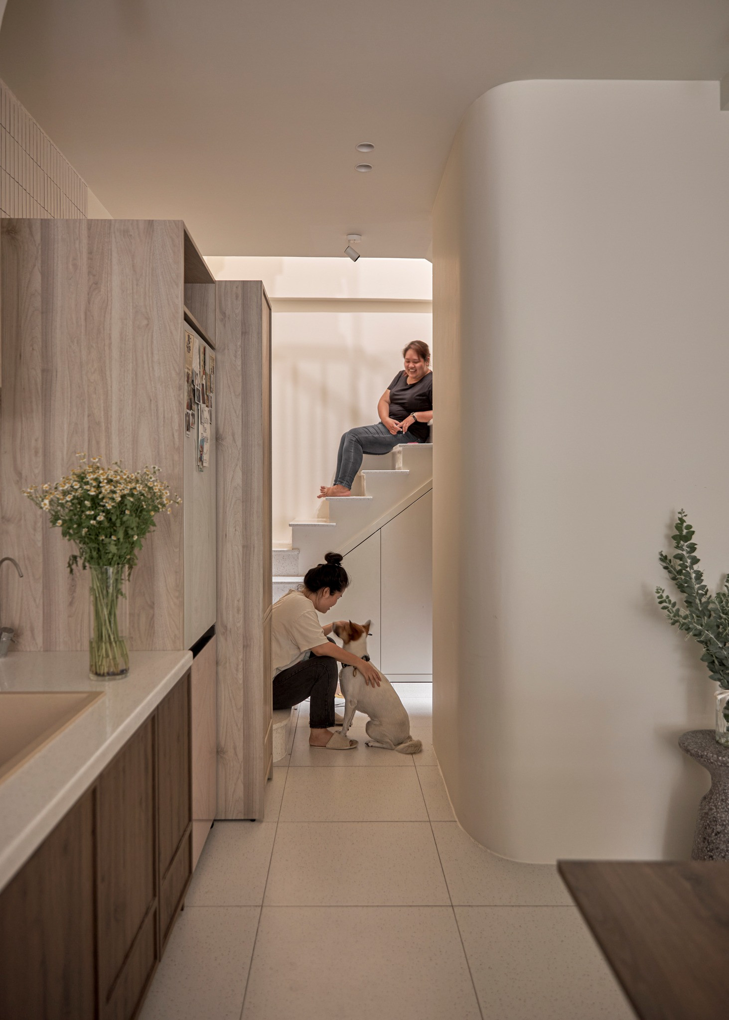 Với mục đích và công năng dành cho số lượng ít người nên không gian được bố trí vật dụng xuyên suốt. Cầu thang cũ được tháo dỡ, chuyển vào cuối nhà.