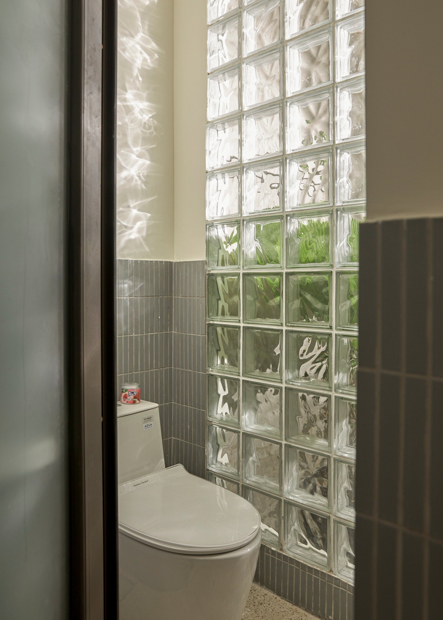 Phòng vệ sinh nhóm thiết kế dùng gạch kính để lấy ánh sáng.