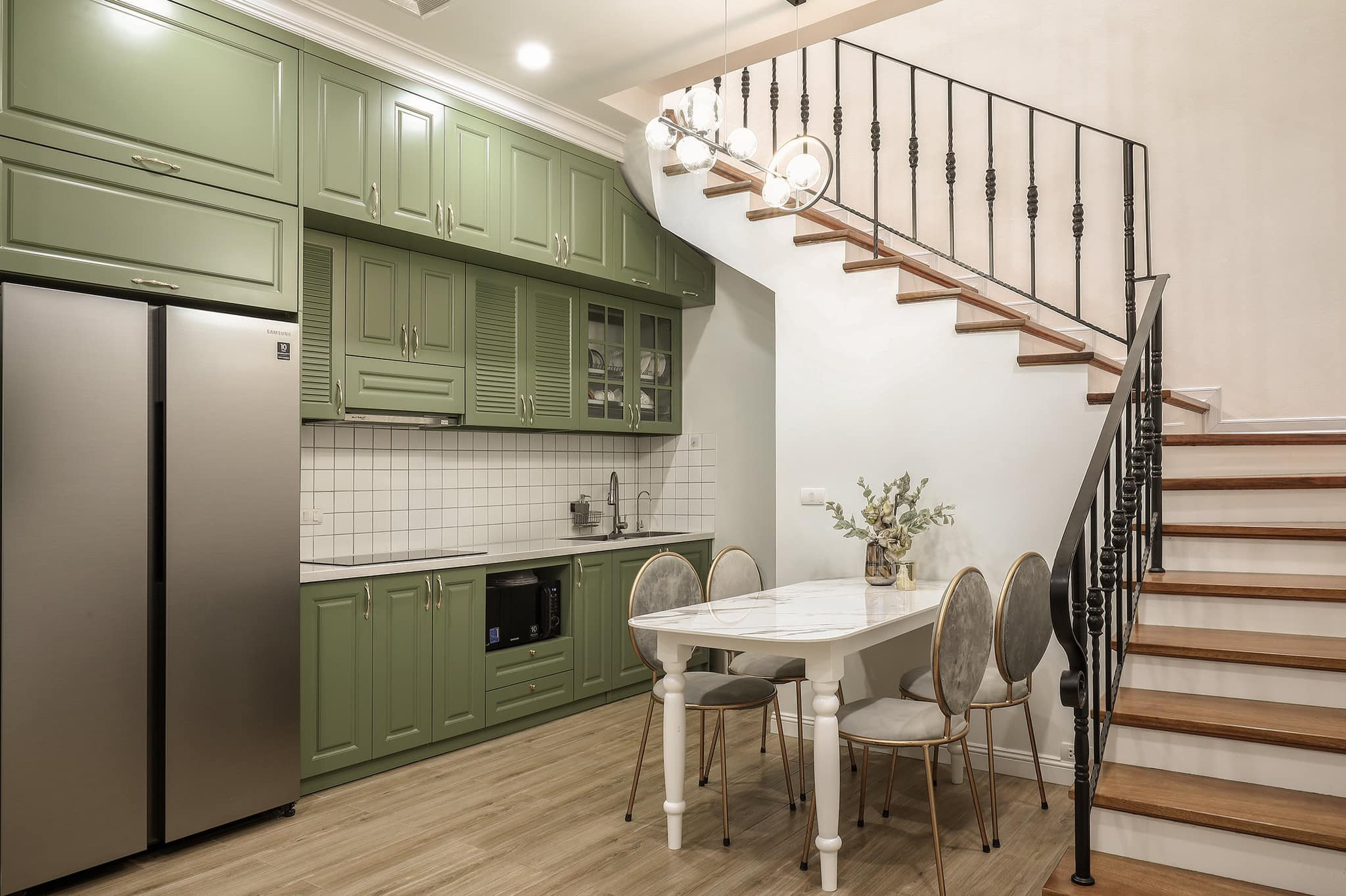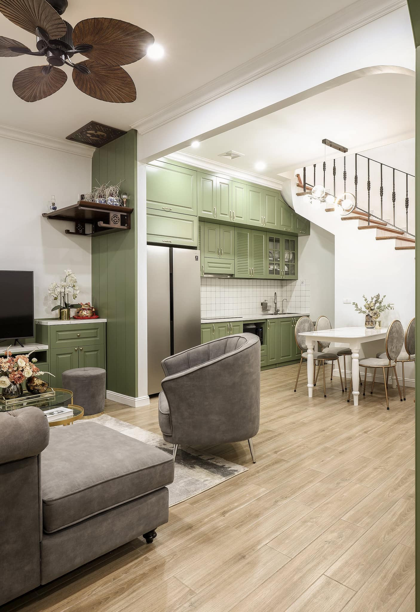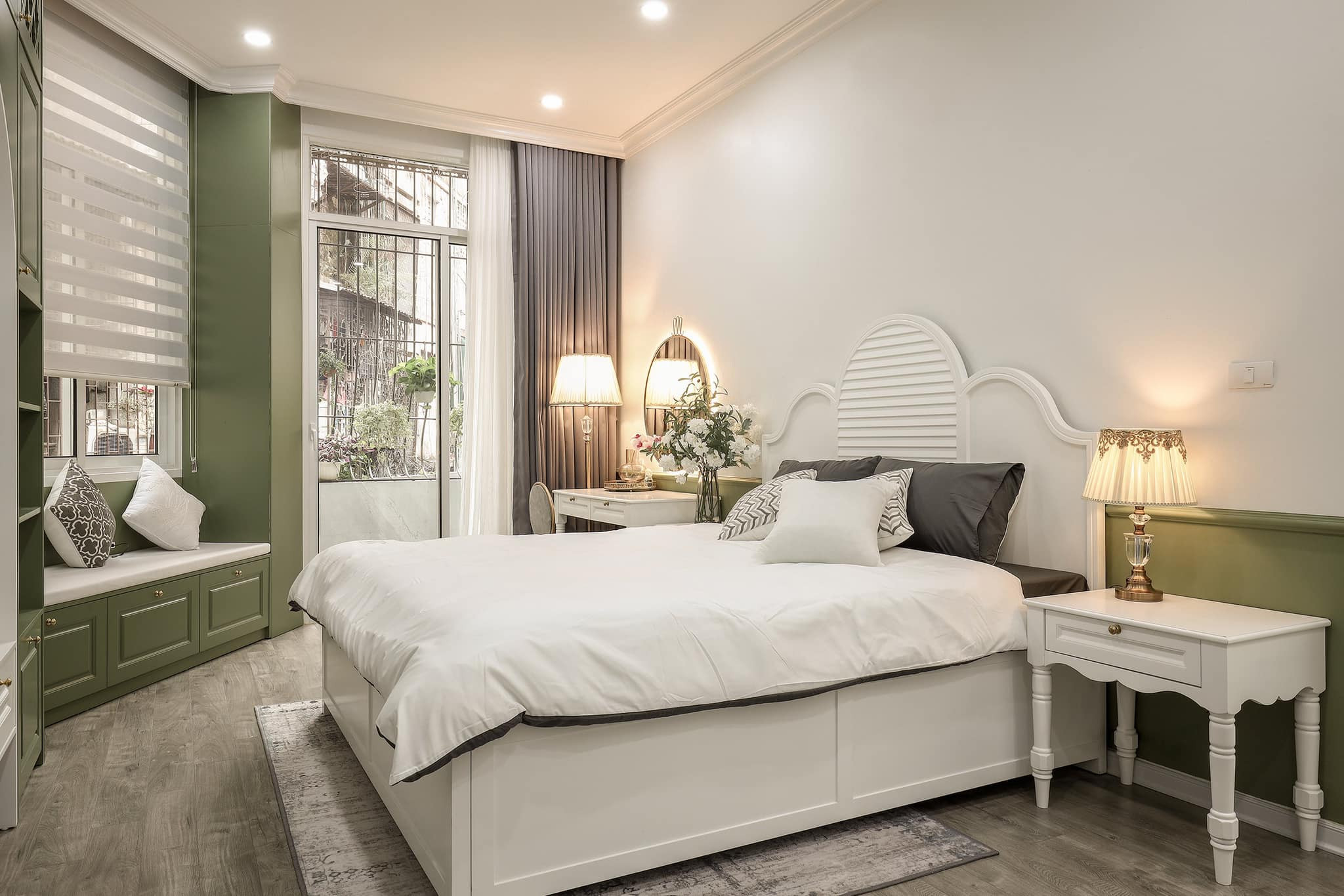 Như ngôi nhà phố thiết kế theo hơi hướng cổ điển, sử dụng gam màu trắng và xanh cốm này là điển hình. Tuy là phong cách cổ điển nhưng nhóm đã tạo ra sự phá cách, hạn chế các chi tiết rườm rà.