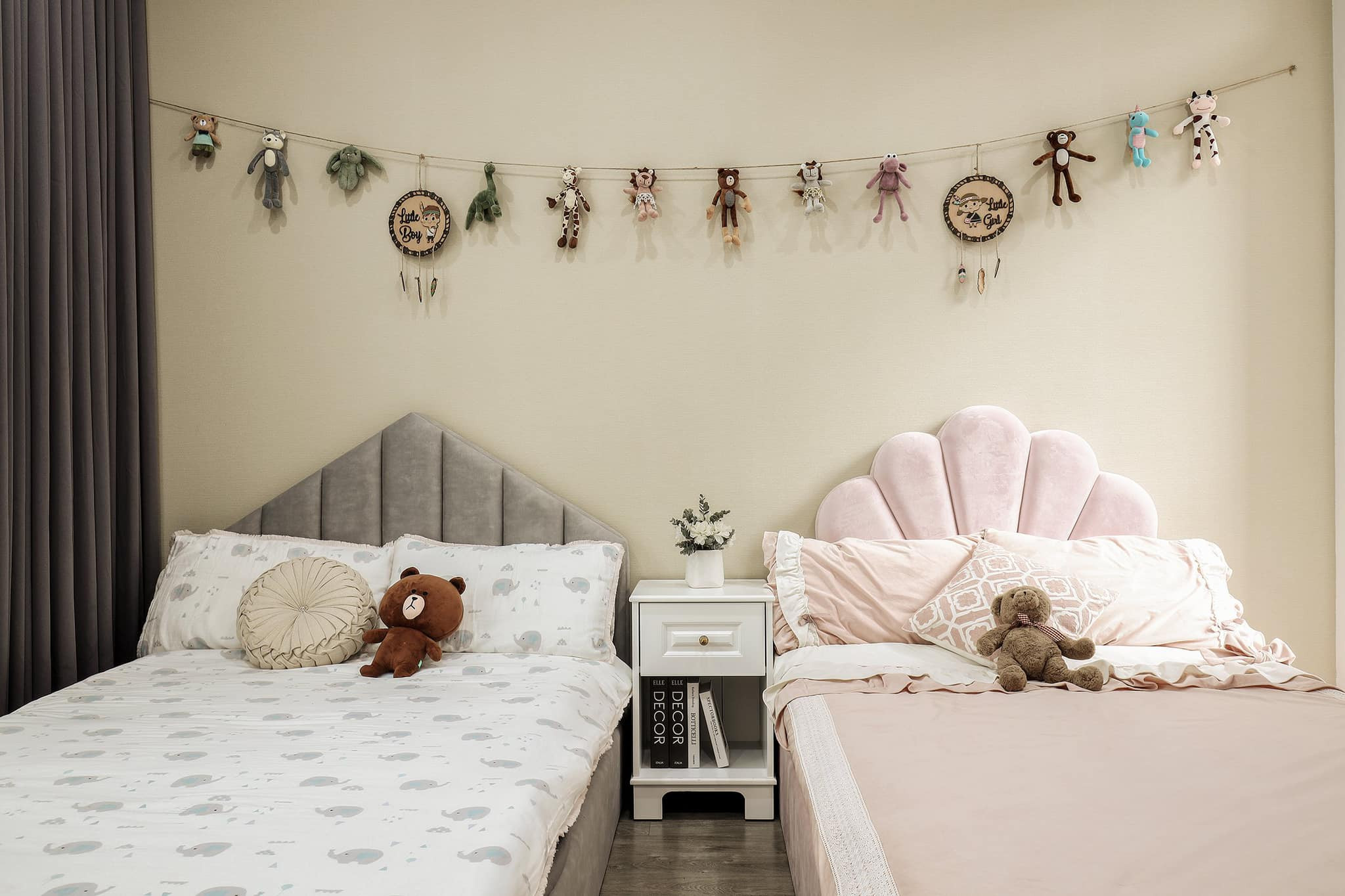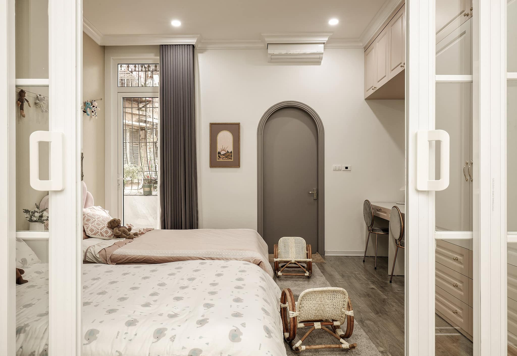 Phòng ngủ cho các bé dùng cửa kính đẩy, thiết kế ô carô tăng tính thẩm mỹ cho nhà. Sàn gỗ tone màu xám nhạt, ấm áp và dễ vệ sinh.