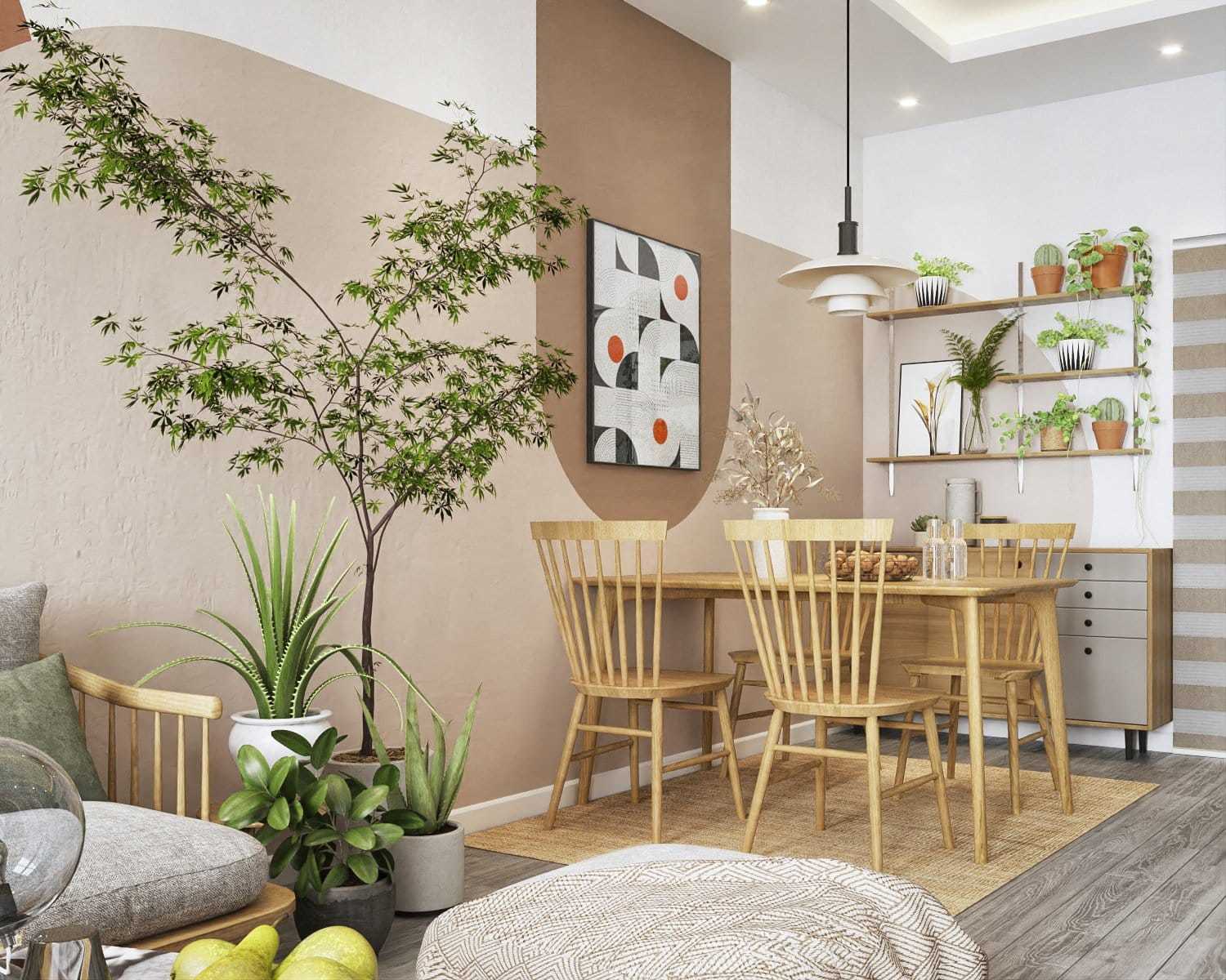 Khách và bàn ăn liền mạch nhưng phân biệt bằng các mảng màu và bố cục sắp xếp khác nhau.