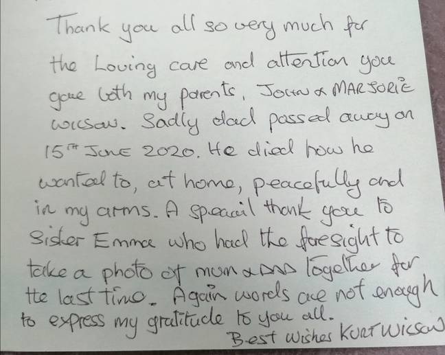 Khi nhận được tấm ảnh chụp khoảnh khắc từ biệt của cha mẹ mình, Kurt - con trai hai cụ, đã viết một lá thư cảm ơn bệnh viện. Trong thư, ông cảm ơn bệnh viện Queen Hospital Burton vì đã ghi lại khoảnh khắc thiêng liêng này và khen ngợi các y tá, bác sỹ đã đảm bảo rằng cha ông có thể “được ra đi theo cách mà ông muốn, bình yên trong tay con trai ông”.
