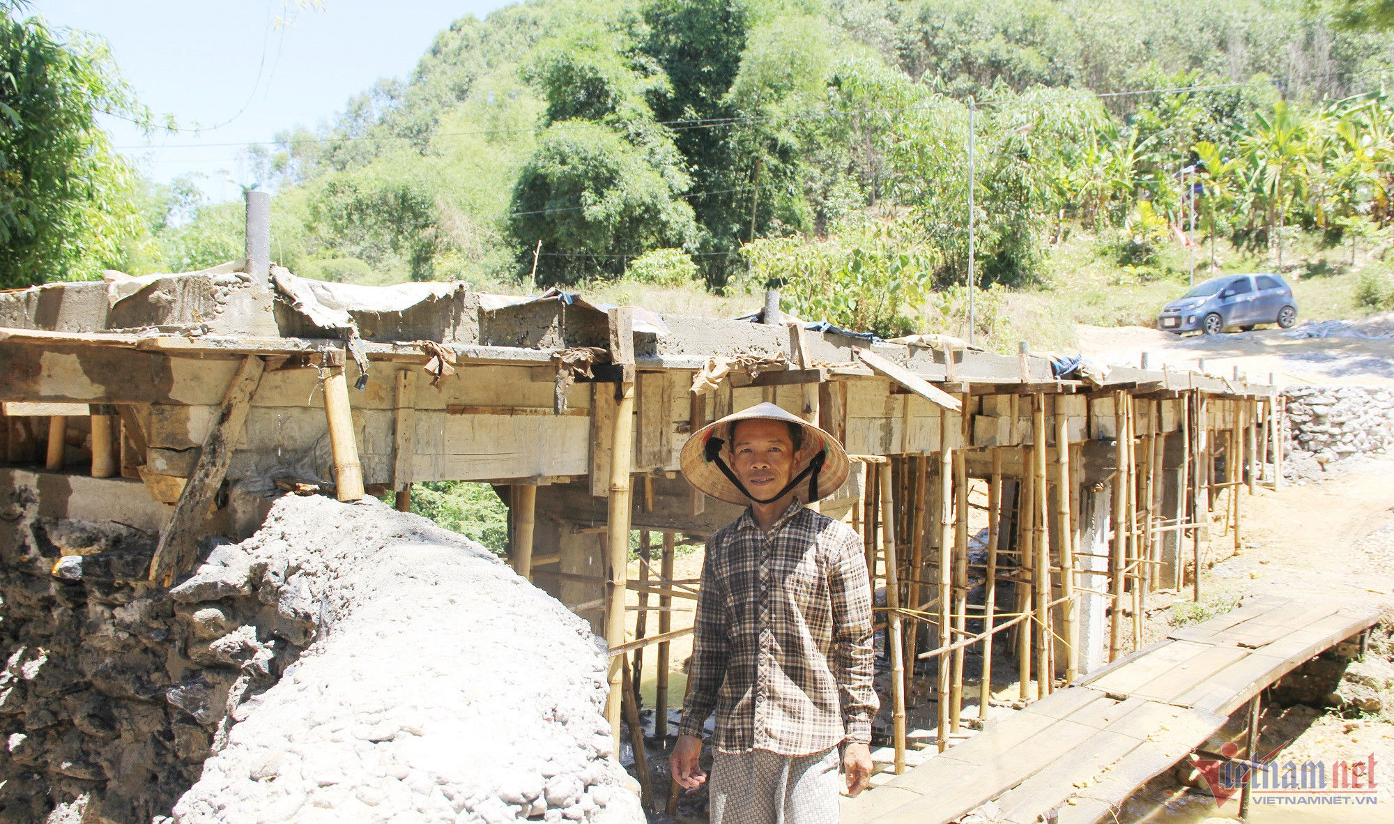 Chiếc cầu bê tông cốt thép này được anh Phúc tự mò mẫm, thiết kế với chiều dài 17m, gồm 5 nhịp, rộng 2,5m, cao 5m, đã được địa phương xem xét thống nhất.