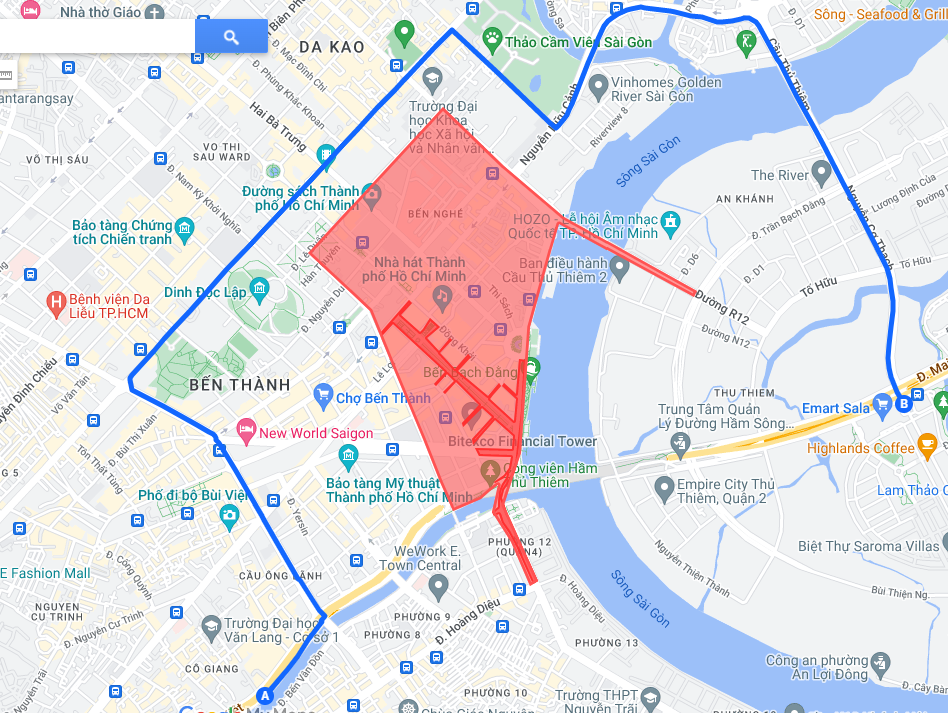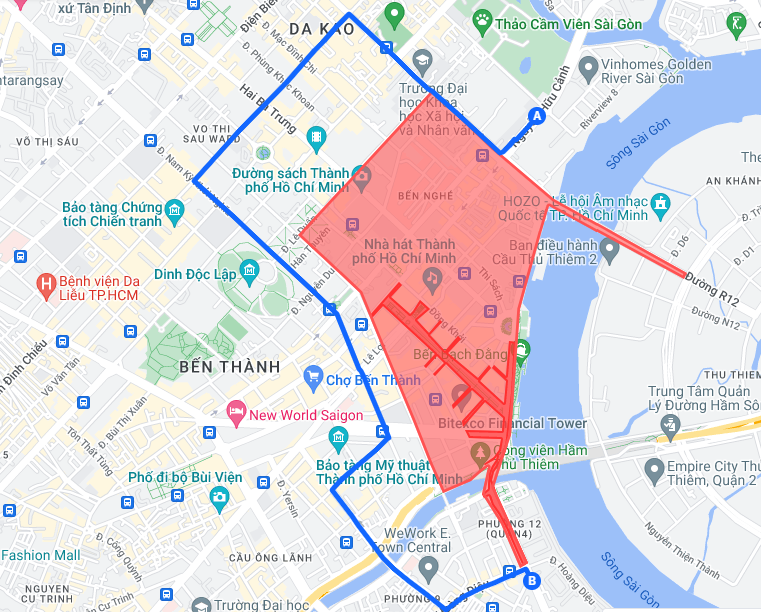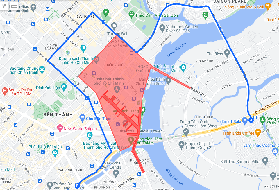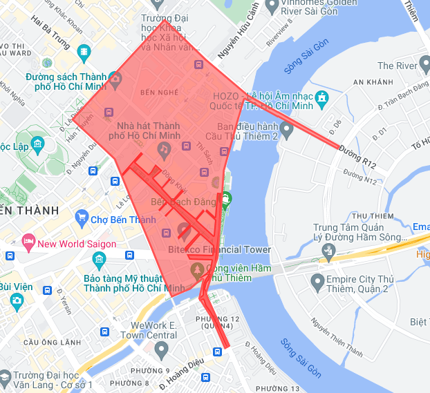 Vành đai phong tỏa được tạo bởi các tuyến đường Võ Văn Kiệt – Tôn Đức Thắng – Lê Duẩn – Pasteur (quận 1); đường Nguyễn Tất Thành, quận 4: Đoạn từ đường Hoàng Diệu đến cầu Khánh Hội (kể cả cầu Khánh Hội); Cầu Thủ Thiêm 2 (cầu Ba Son) với phần cầu chính và các nhánh cầu (kể cả đường R12, TP Thủ Đức).