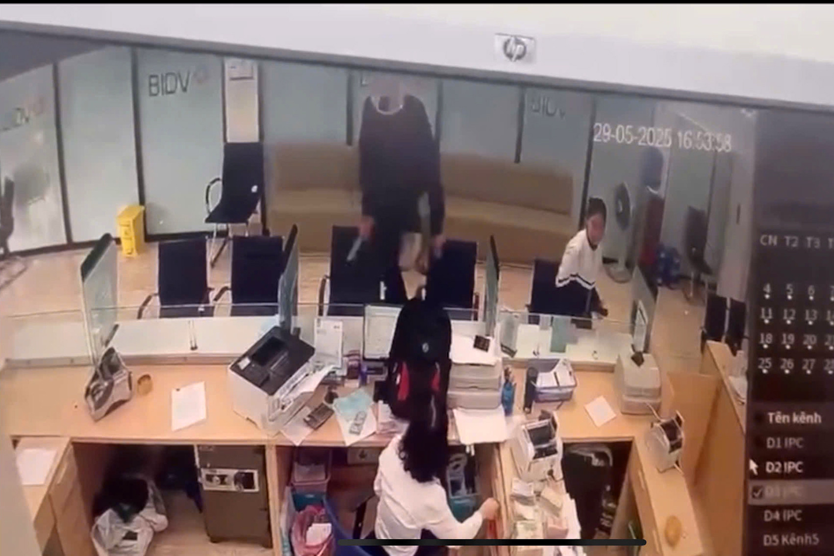 Người này cầm theo balo và một vật giống dao rồi lập tức ném balo vào quầy thu ngân, thời điểm này có 1 nữ nhân viên ngân hàng và 2 người khác.