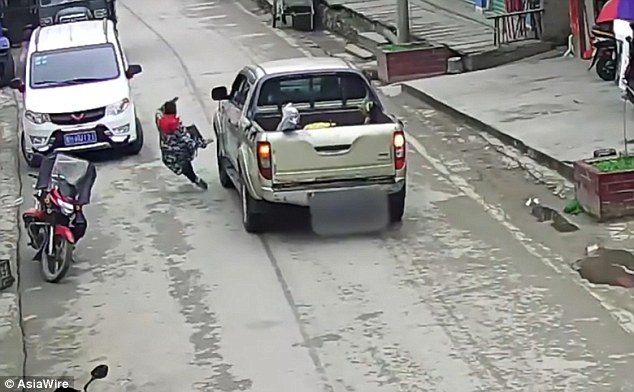 Một bà mẹ ở phía tây nam Trung Quốc đã bất chấp nguy hiểm tính mạng, lao ra phía trước xe bán tải để cố gắng cứu con trai khỏi bị đâm.