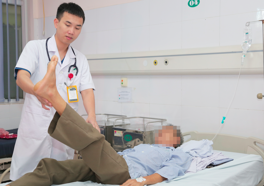 Ông D. được chẩn đoán đột quỵ não thể nhẹ, dùng thuốc kháng tiều cầu kép, kiểm soát huyết áp, kiểm soát mỡ máu. Sau dùng thuốc khoảng 30 phút, ông đã có thể tự nói được, cơ lực cải thiện rõ rệt, tay và chân bên phải vận động nâng lên khỏi giường, ý thức tỉnh táo.