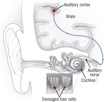 Khi các tế bào lông nhĩ bị hư hại - ví dụ như khi tiếp xúc với tiếng ồn lớn - các mạch trong não sẽ không nhận được tín hiệu mà chúng mong đợi. Điều này kích thích các tế bào thần kinh phải tăng độ nhạy của chúng lên, dẫn đến các ảo giác về âm thanh.
