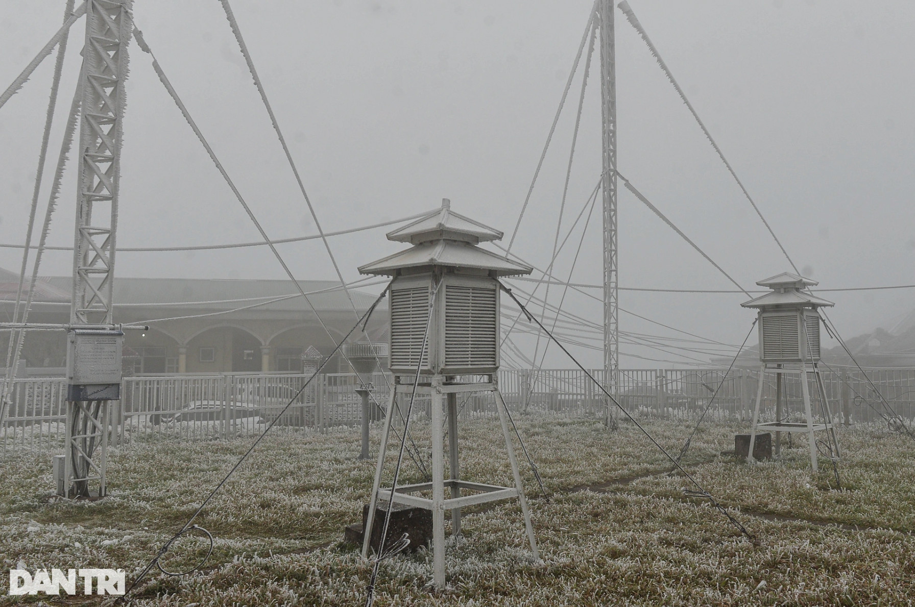 Khu vực đặt nhiệt kế, máy đo độ ẩm không khí, nhiệt độ, tốc độ gió... bị băng giá phủ trắng trong sáng 24/1. Nhiệt độ đo được tại đỉnh Mẫu Sơn lúc 7h sáng 24/1 là -3 độ C. Theo anh Hùng, khu vực Mẫu Sơn là nơi đón khối gió mùa đông Bắc đầu tiên vào Việt Nam. Chính vì vậy, mùa đông nơi đây rất khắc nghiệt và thường xuyên có sương mù, giá buốt.
