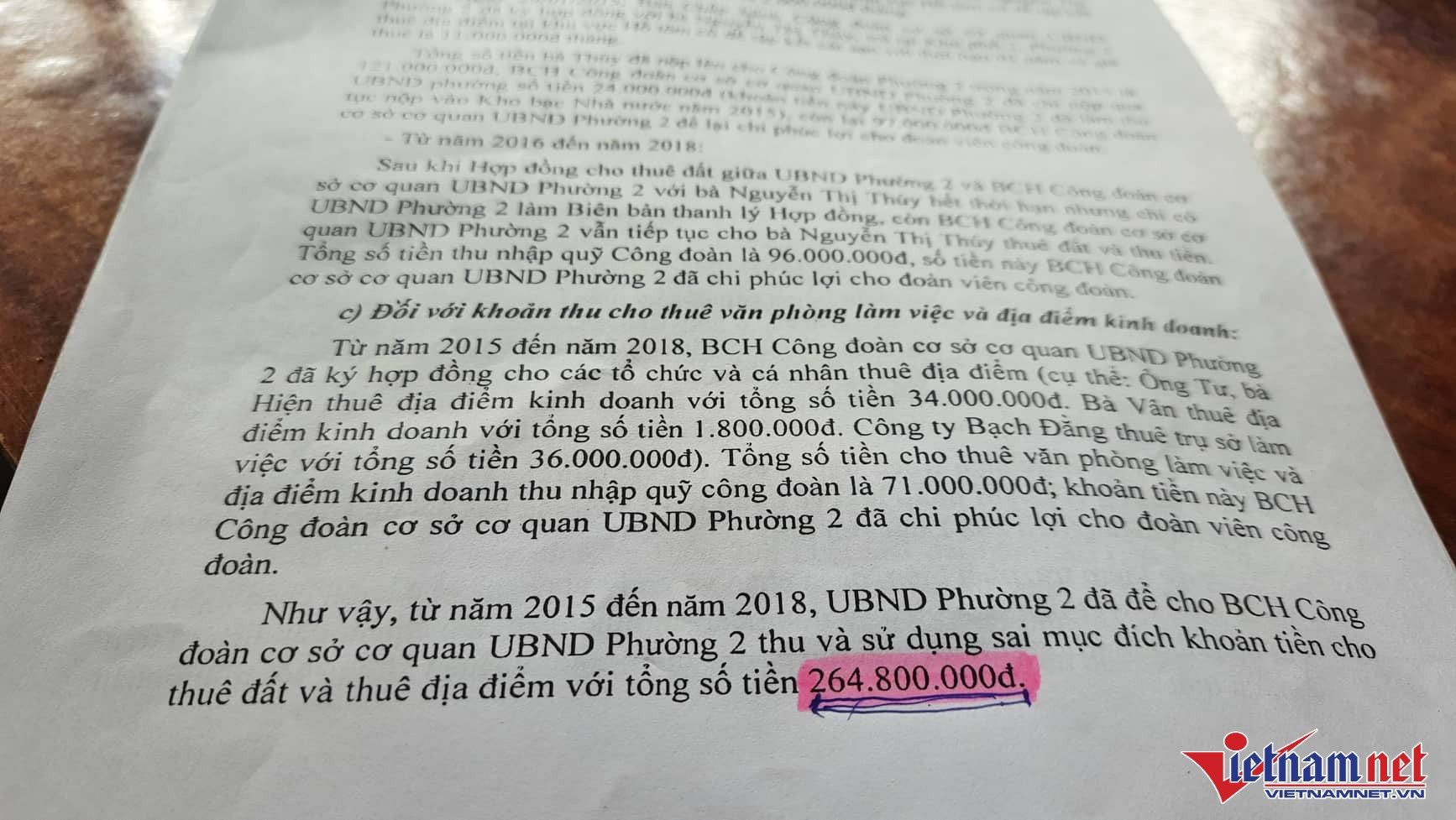 Như vậy, trong 3 năm, UBND phường 2 đã để cho Ban chấp hành Công đoàn cơ sở cơ quan UBND phường 2 thu và sử dụng sai mục đích khoản tiền cho thuê đất và địa điểm với tổng số tiền 264 triệu đồng.