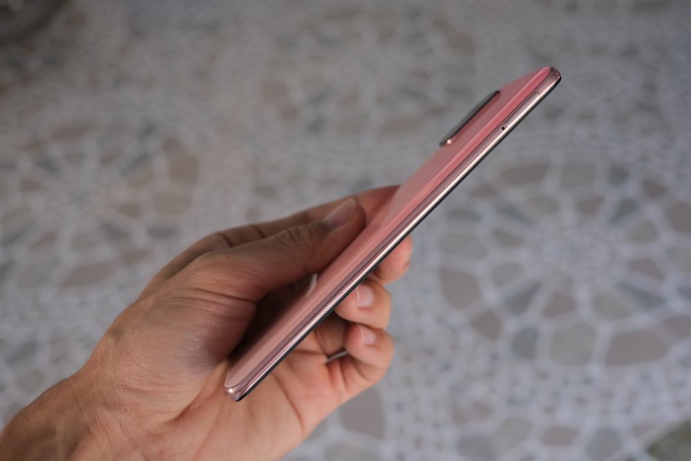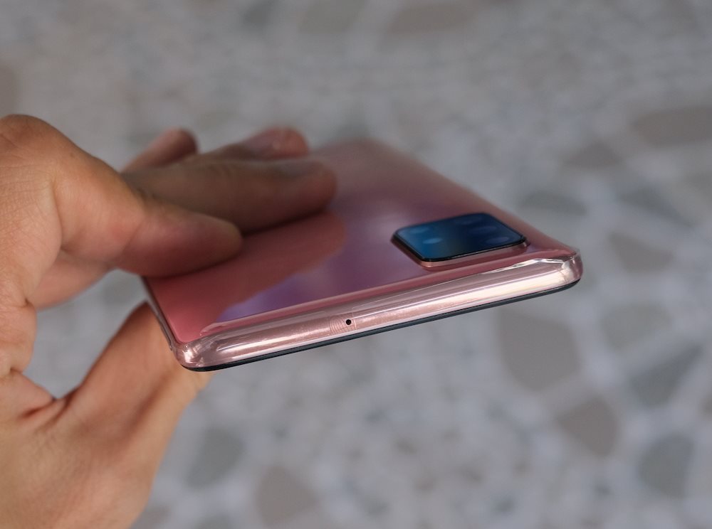 A71 và A51 đều có mặt lưng kính bóng bẩy. Màu hồng được thiết kế chuyển màu đậm từ phía camera và nhạt dần xuống dưới. Tuỳ góc nhìn khác nhau, màu sắc sẽ có chút thay đổi nhẹ.
