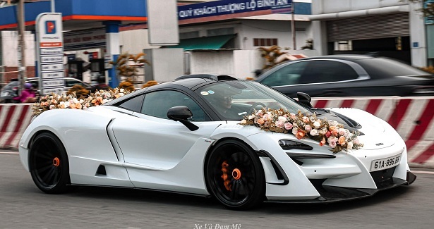 Gây chú ý nhất trong dàn siêu xe tham gia lễ đính hôn là chiếc McLaren 720S dẫn đoàn. Đây cũng chính là siêu xe mới nhất được Tống Đông Khuê bổ sung vào bộ sưu tập của mình vào đầu tháng 6 năm nay. Đây là siêu xe McLaren 720S độ N-Largo độc nhất vô nhị tại Việt Nam. Phần đầu xe mang cảm hứng từ Senna trong khi đuôi xe được bổ sung cánh gió cỡ lớn.