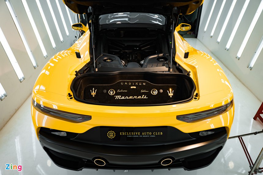 Loạt chữ cái "CASIKEN" và "Exclusive Edition" được mạ vàng tạo điểm nhấn cho phần đuôi xe. Logo chữ Maserati được lắp ở nắp cốp sau. Khung biển số Maserati MC20 được thiết kế riêng. |